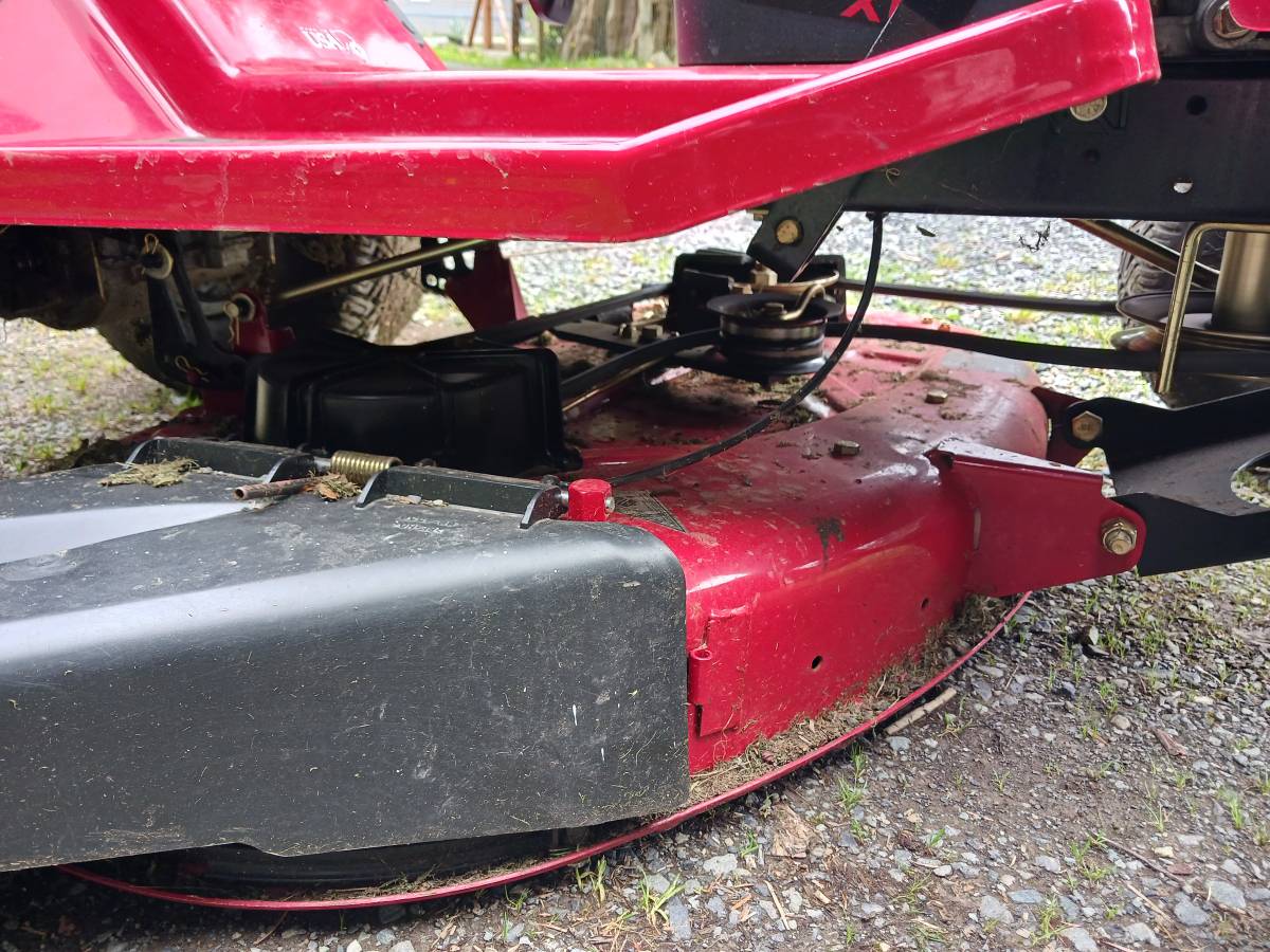 This is a 1998 Toro wheel horse 13-38 XL Lawn Tractor Riding Lawn Mower that is being sold. It is in excellent condition and was found in a barn, having only been used from 1998 to 2012, and then stored in a shed for 11 years. As can be seen in the picture, it is still in its original, very clean condition and is ready to be used for mowing. It is powered by a 13.0 horsepower Briggs engine, which provides ample power for pulling and mowing. The mower has just had a fresh oil change and runs well. It also has a larger gas tank for longer mowing sessions. The 38″ mowing deck with 2 blades allows for quick and precise mowing of large areas, and is operated by a cable clutch. The mower blades are like new, and the original paint is still intact under the mowing deck. The MST205 transmission has 5-speed shift on the go, making it easy to operate. The tractor appears to have low hours on it and has very good original tires on both the front and back. It has been cleaned and serviced and has a tight turning radius. This mower is in fantastic working condition and is ready to be used for mowing.