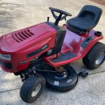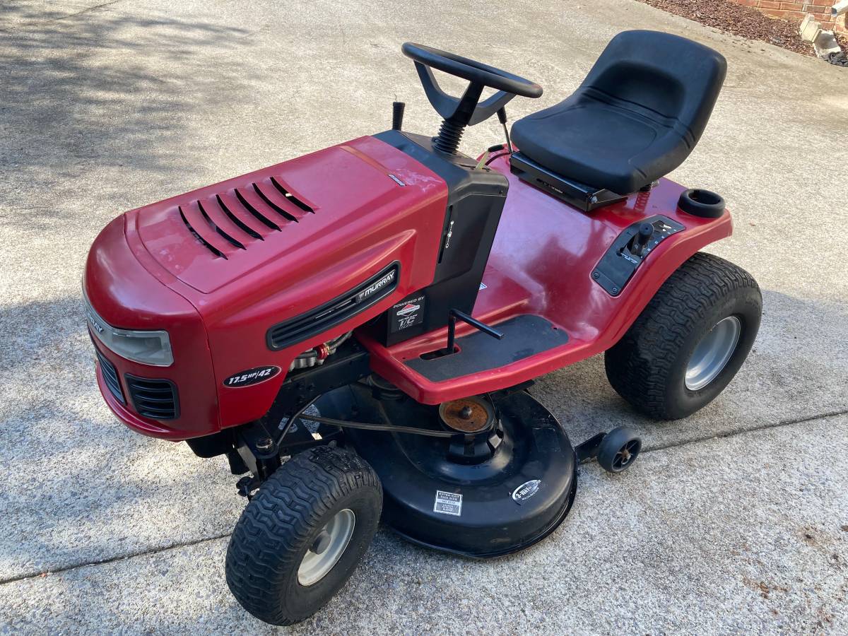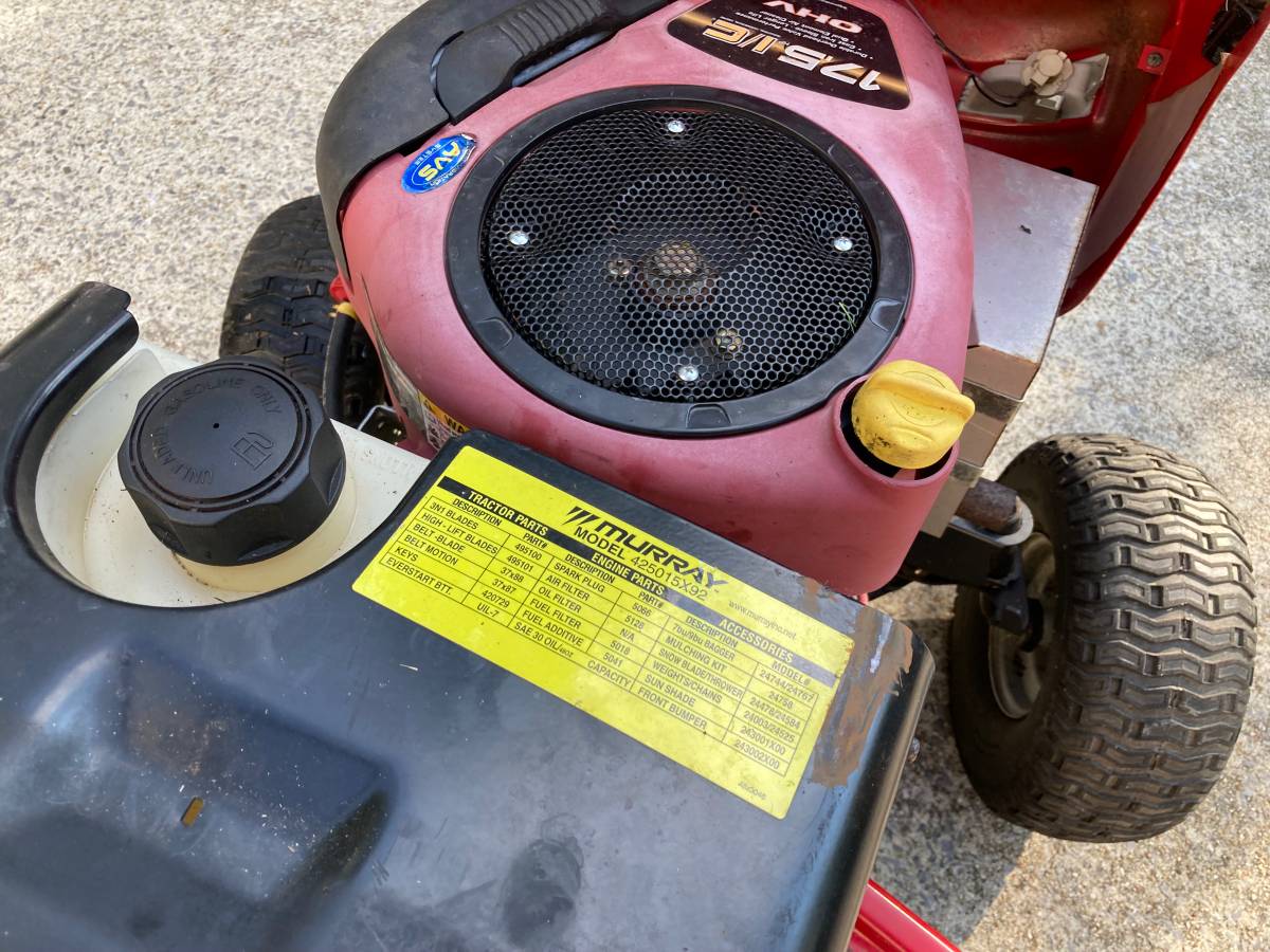 Used Murray 42″ riding lawnmower, model number 425015X92, with 17.5 HP Briggs & Stratton engine that runs excellently, new battery, new rear tire inner tubes, and freshly serviced with blades that have been sharpened, all bearings lubricated, fresh oil changed, and new air filters.
