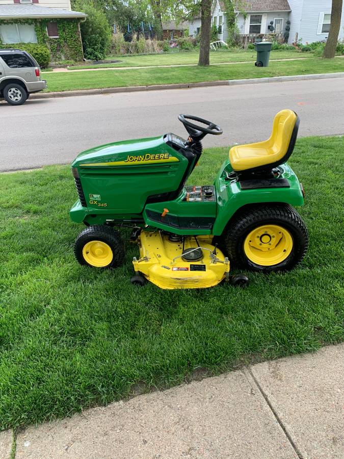 Used John Deere GX345 Riding mower from 2005 with cruise control, 54 inches deck, power steering, hydrostatic drive, 20 hp Kawasaki V-Twin liquid cooled with 485 hours on it. Tires like newcomers. Mower is in excellent condition overall.