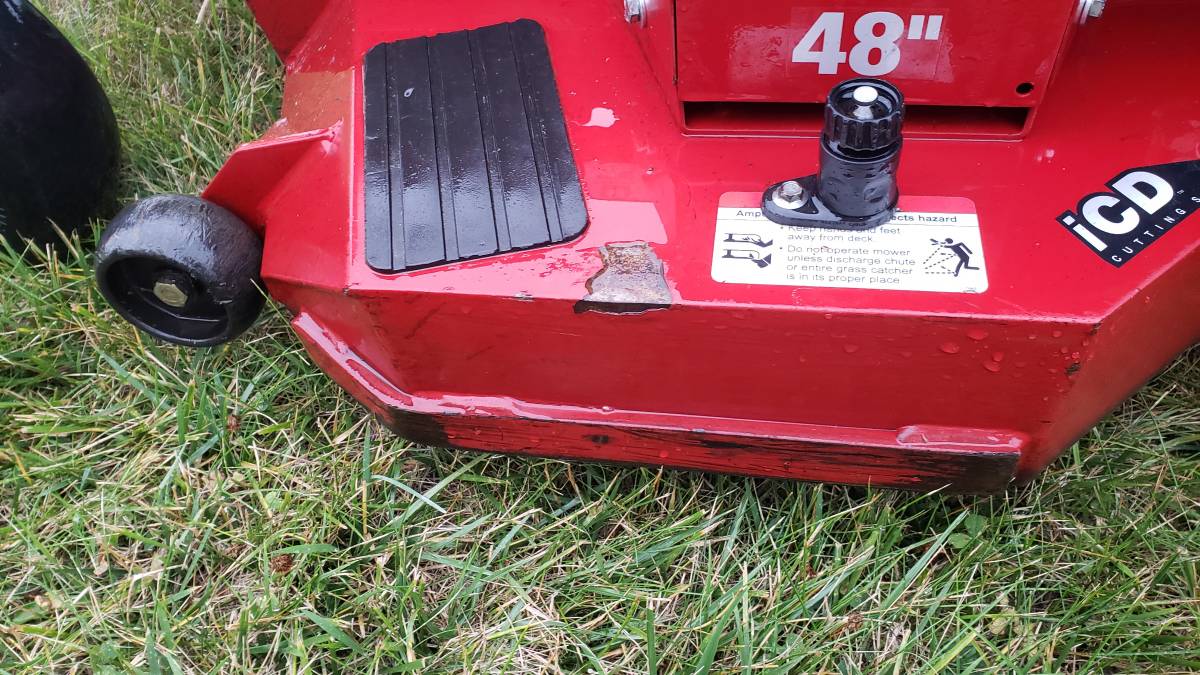 Has some battle scars from mowing around our septic tank access and driveway boulders on the left deck side (kid learned how not to mow around said objects).