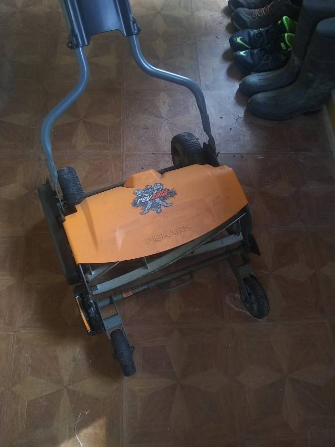 Fiskars maxreel reel mower, which was purchased in 2018 and has truthfully mowed a quarter acre lawn since then. While I have tightened them twice (each spring) to make sure they are cutting properly (use a piece of paper to measure cut-can show you how), the chain is frequently oiled and blades are self-shaven. Front or rear grass discharge and adjustable cutting height.
