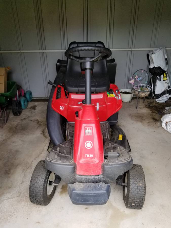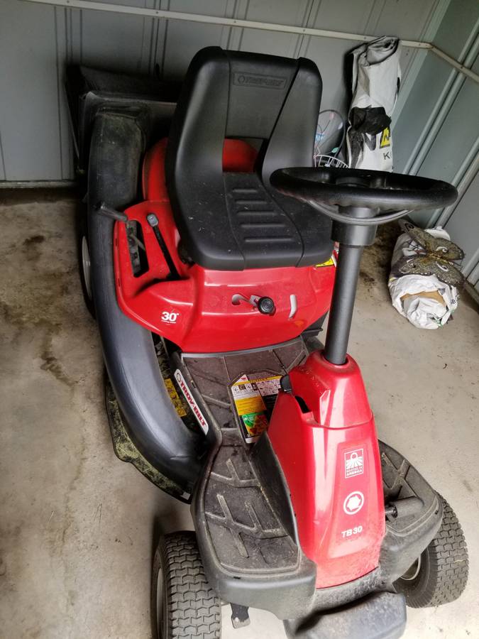 Troy Bilt TB30 Riding Lawn Mower, bought last year (2019) Charged $1,500 Costs the double bags as well. Used it 5-6 times, maybe. Space-saving model makes it really easy to store the riding mower in garages and warehouses. Designed with U.S. and Global Parts in America since 1937. Perfect size for smaller or gated yards and suits through most of the gates with a 30-in cutting deck. Quickly move from side discharging grass clippings to mowing, which helps avoid the build-up of thatch and makes your lawn healthy by adding nutrients to the soil. The high-performance Troy-Bilt engine is done to ensure successful start-up in all environmental conditions. Ride more comfort with decreased noise with the Soft Touch steering wheel.