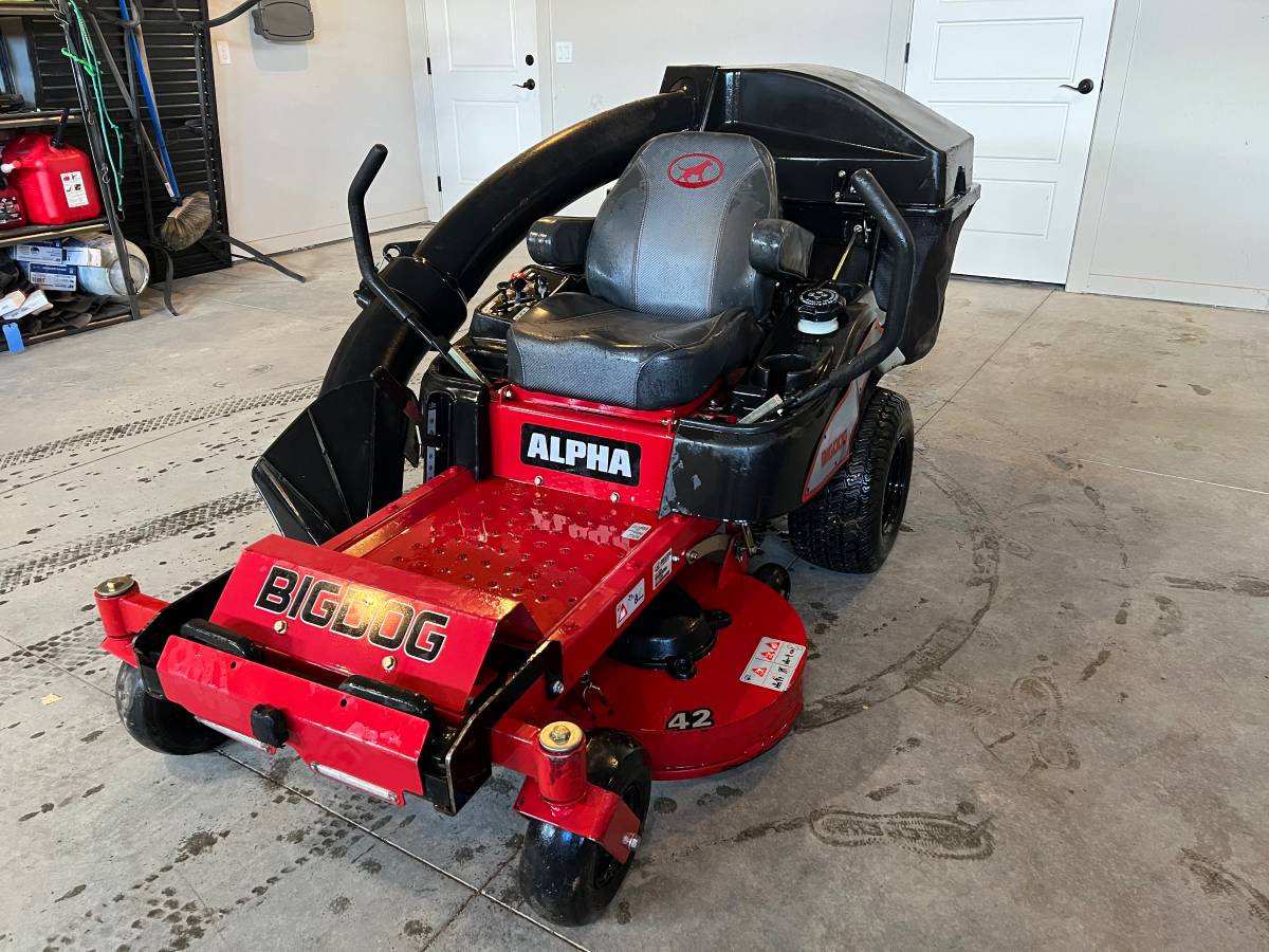 This is a 2020 model BigDog Alpha with only 100 hours of run time! With a 42-inch steel indestructible welded cutting deck and a 21.5 HP Kawasaki motor, this mower is ideal for any size or type of lawn. This commercial grade zero turn mower cuts your mowing time in half. Comes with a double bin bagging system for quickly sucking up and dumping leaves or grass. It also has a front counterweight ballast system and an LED light kit. I also have an extra set of blades to go with it.