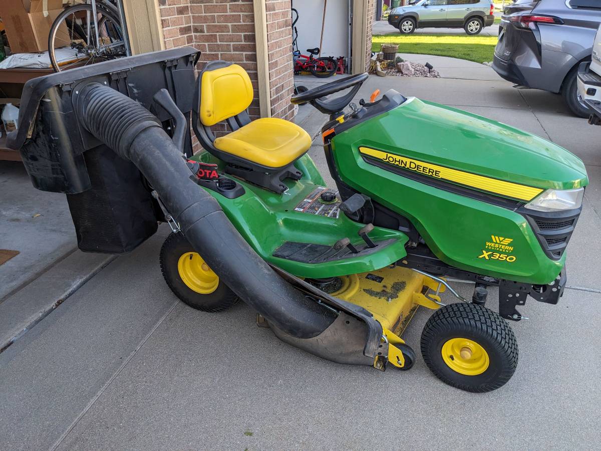 This 2020 Deere X350 has seen minimal use, with less than 100 hours on the clock, and has been kept in a garage throughout its life. The oil is relatively new, having been changed just a few mows ago, and it has never been filled with ethanol gas, always mixed with Sta-bil for optimal performance. The mower is equipped with a battery tender, as the battery was replaced last season, ensuring it remains in excellent condition alongside the rest of the machine.