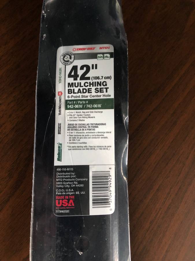 Selling a brand-new, sealed set of MTD Genuine Factory Parts Original Equipment 3-in-1 Mulching Blade Set for Select 42-inch riding mowers. This set, originally priced at $65.31 after taxes at Home Depot, is available for $30 cash. Meet-up locations include Lascassas or Murfreesboro at a public place for convenient pick-up.