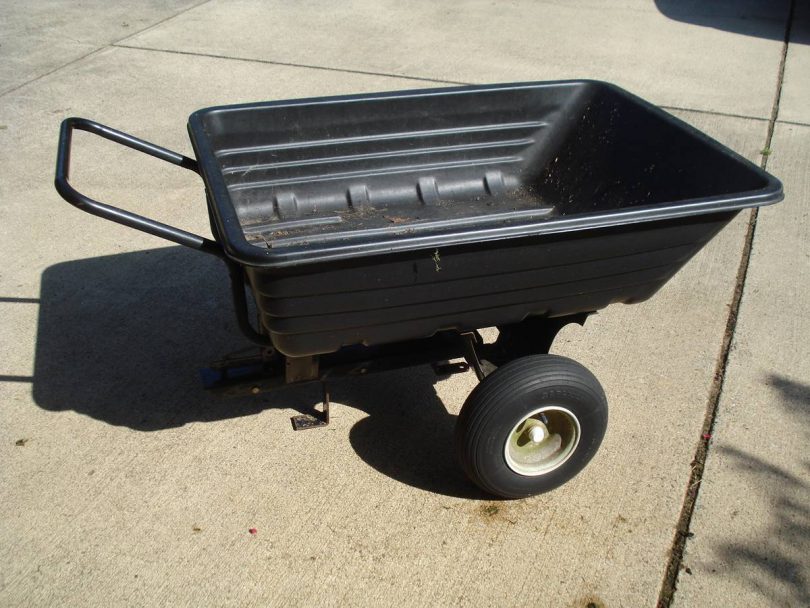 Preowned Agri-Fab dump cart for sale. Pull it down with your mower or drive it by hand. When attached to the mower, it can dump without being removed from the mower. You can also dump when you push by hand. They ‘re selling fresh for around $130, and I’m asking $60 for that. There’s a need for a new wheel.