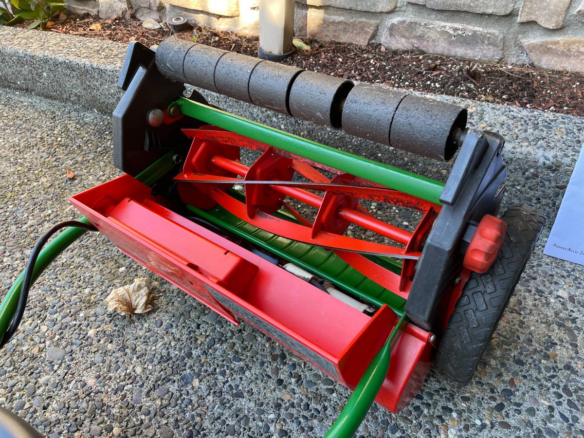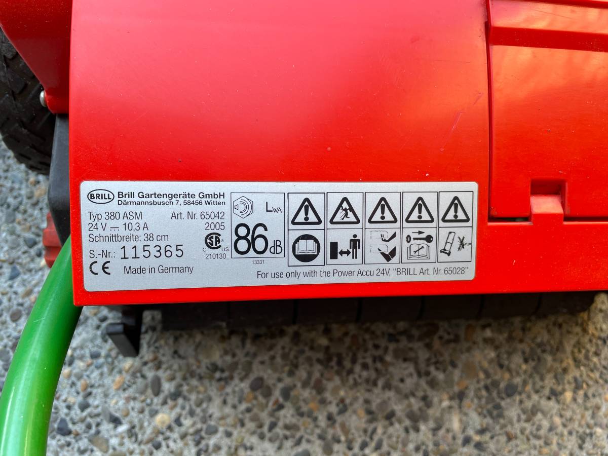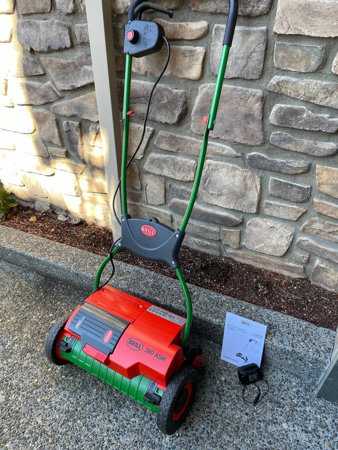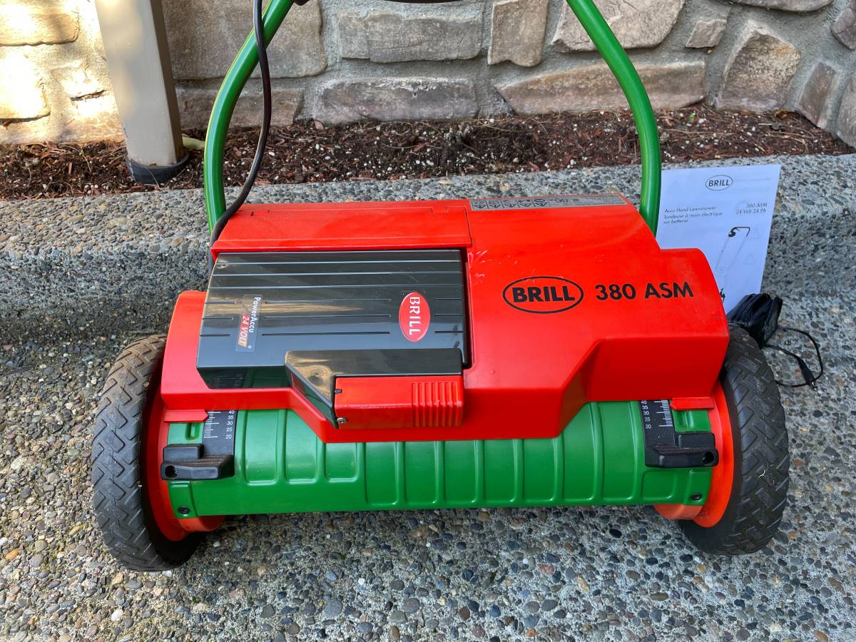 A Brill 380 ASM battery lawn mower in good working order is available for purchase, although it may require blade sharpening. This mower was made in Germany and has had its original 24V NiCd battery replaced with a new NiMH battery recently. It is suitable for small lawns and can adjust cutting height between 0.8″ and 1.8″.