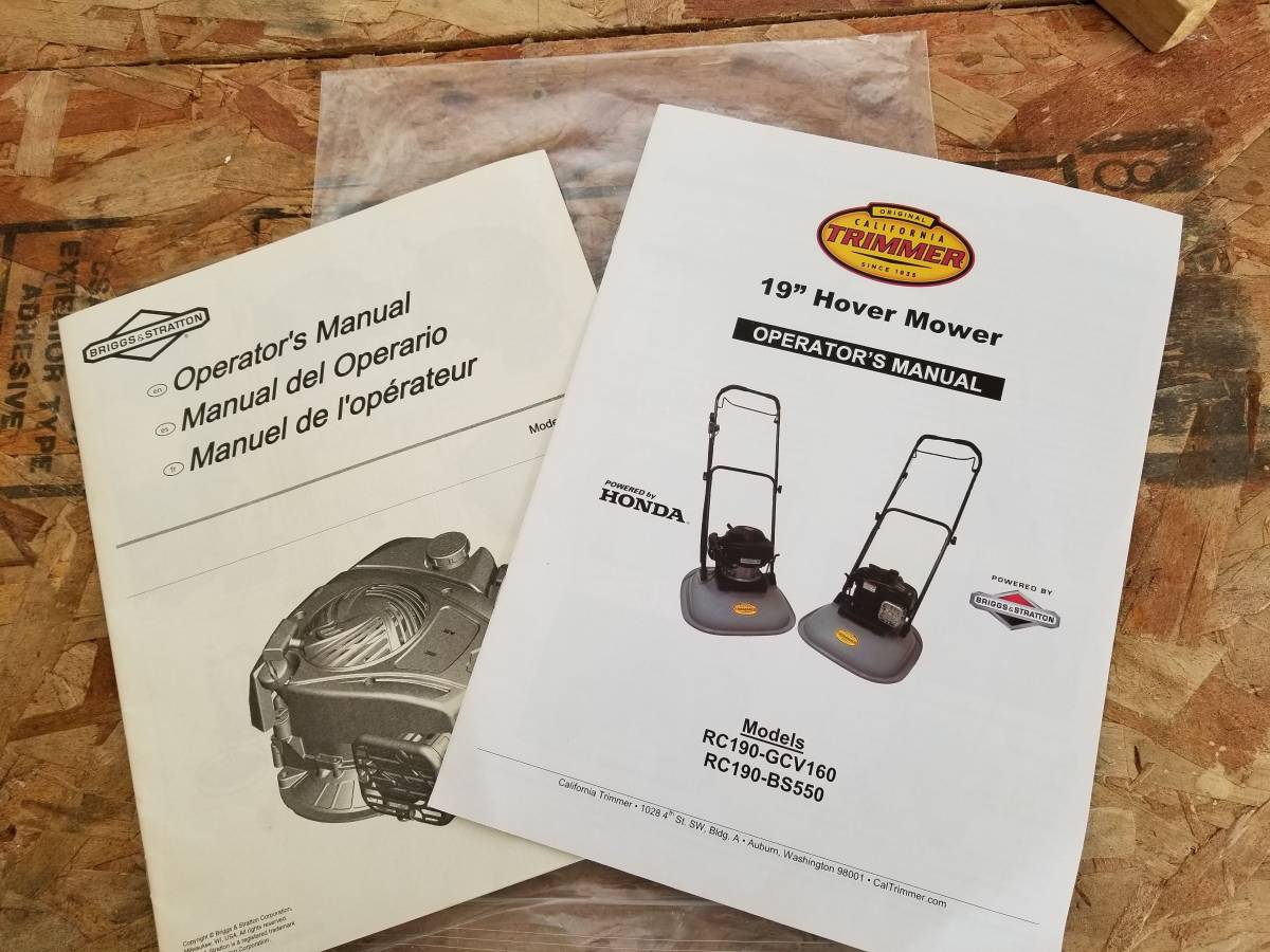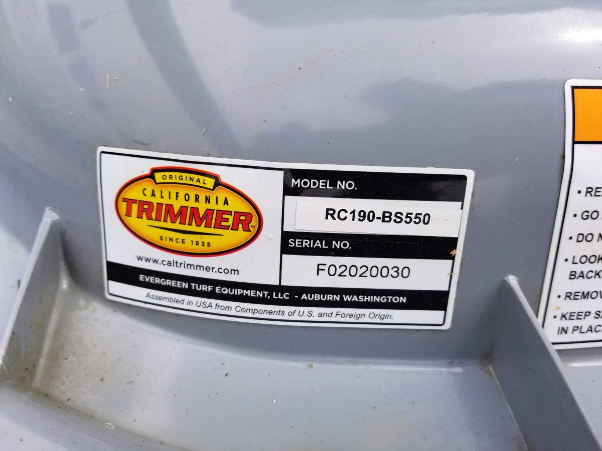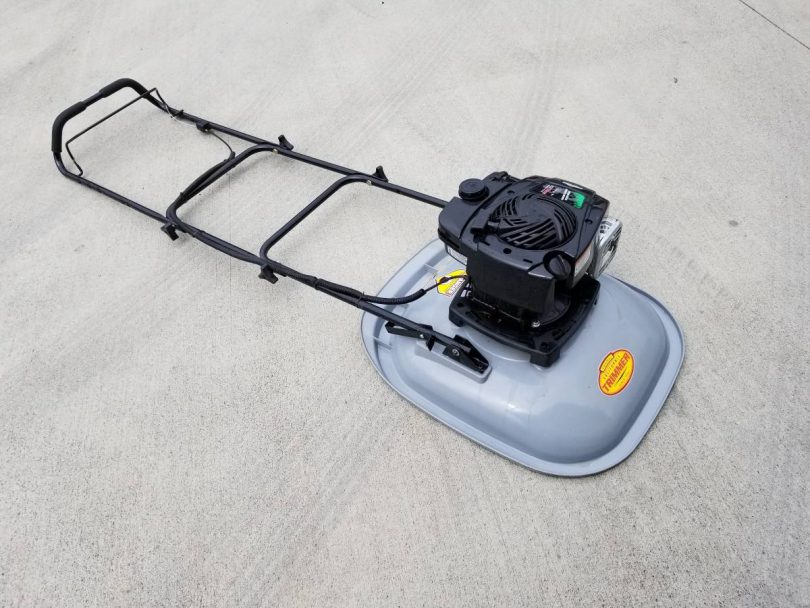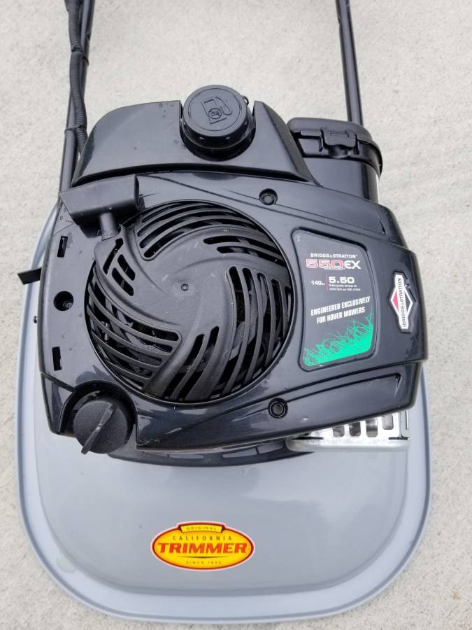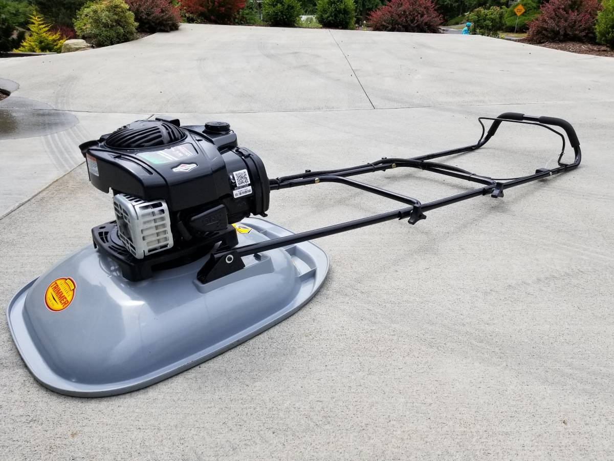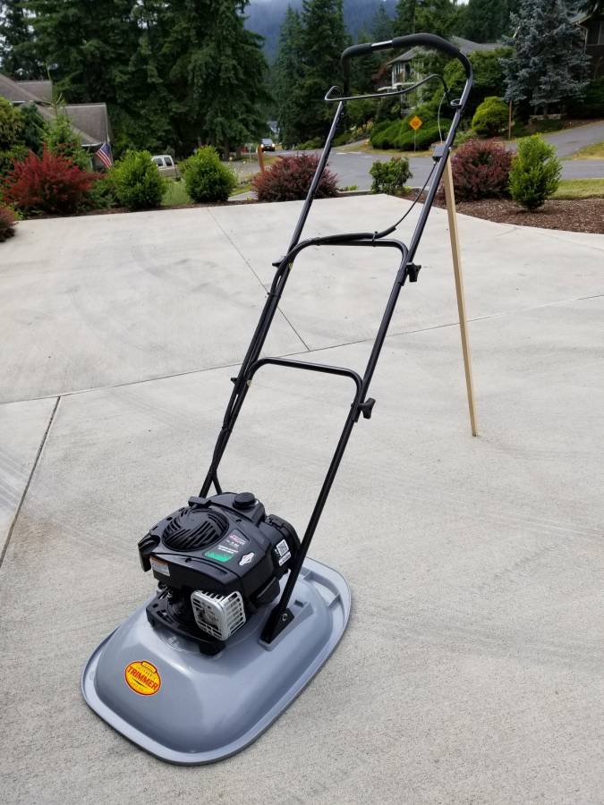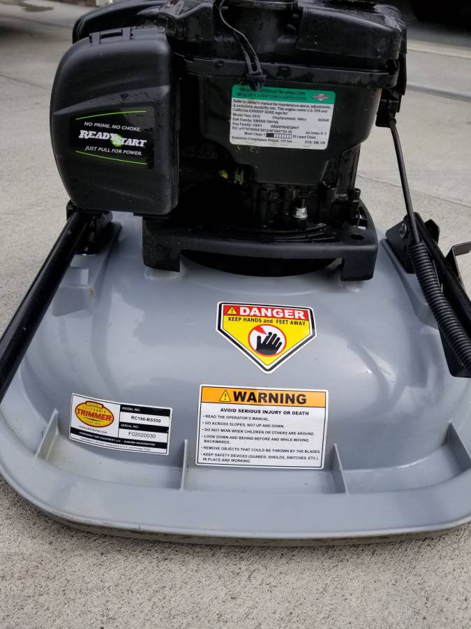 California Trimmer 19 “RC190-BS550 Hover Mower with 18” handle extension kit and Briggs and Stratton 550ex “Ready Start” motor (no prime, no choke). This mower weighs only 36 lbs and is intended for up to 45 degrees of mowing slopes. The 18 “handle extension makes mowing longer slopes simpler. This mower is only one year old with about 6 hours of running time. It costs more than $600 new with the handle extension and works great, but I chose to go all electric.