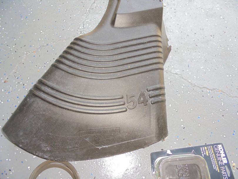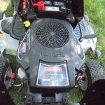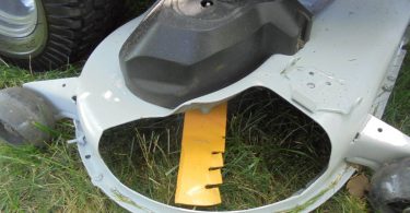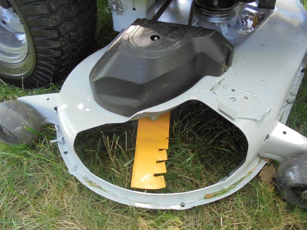 The deck has a cover for mulching and a chute for discharge. Also note that there is not a spring to the discharge chute. This machine starts up straight and is powerful and reliable, although it can smoke before warm. It takes 340 hours to complete