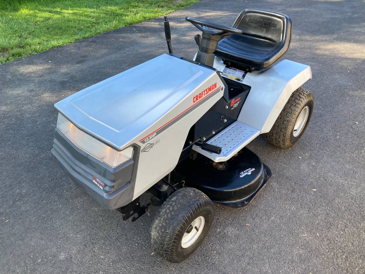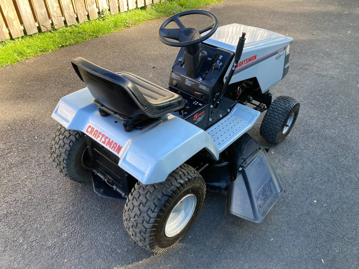 Available for purchase is an excellently maintained Craftsman riding mower model LT4000. It features a powerful 12.5 hp Briggs engine, a 38-inch deck, and a five-speed manual transmission. The mower has recently undergone maintenance, including fresh oil, a new fuel filter, a new fuel shut off valve, inspected belts, greasing, a new battery, and sharpened blades. It is fully prepared to efficiently mow your lawn.