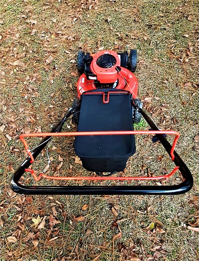 Grass clippings are collected in the rear bag for easy cleanup or composting.