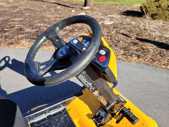 The RZT S 42’s steering wheel control and four-wheel steering make it safer and more stable on sloping terrain than traditional lap bar controlled zero turn mowers.