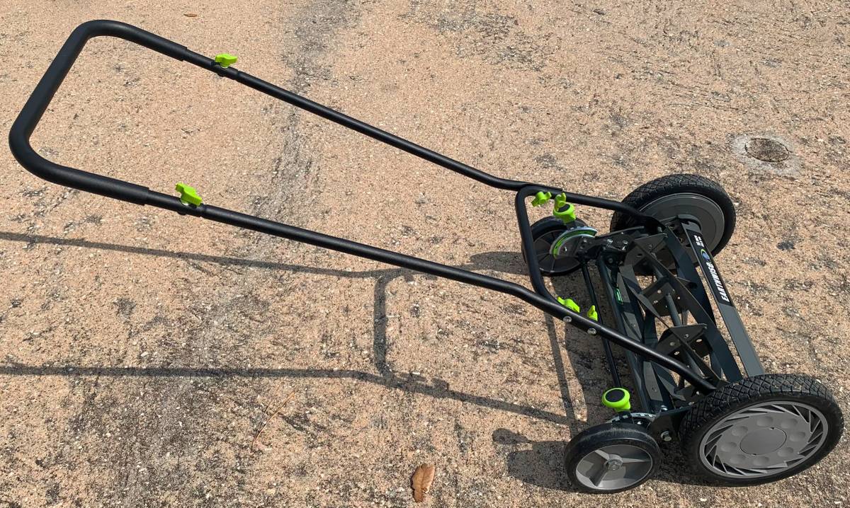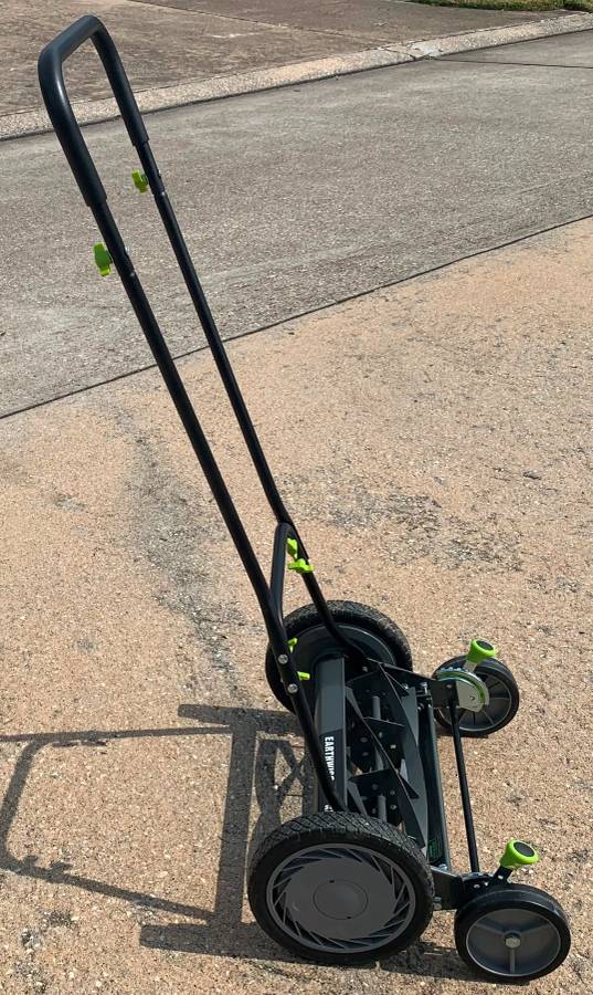 Almost brand new Earthwise Reel Lawn Mower for sale. Cutting width of 16 inches, 5-blade ball bearing reel, and 10-inch composite wheels with 6-inch rear-trailing wheels.