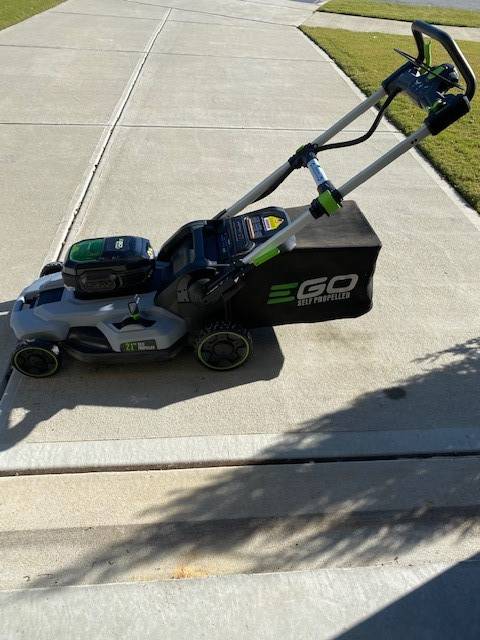 In excellent condition, an EGO Power+ 56-volt lithium ion self-propelled 21-inch cordless electric lawn mower is for sale. Used for 2 seasons only. Did come together with bagger, attachment, 7.5 Ah ARC Lithium Fuel Gauge battery and battery charger if no bagger is available. Joy the mower. The only reason we sell it is that a lawn service has been hired. It was kept in the garage the whole time.