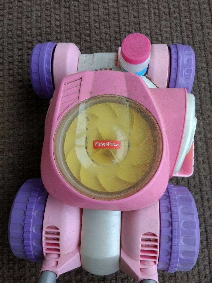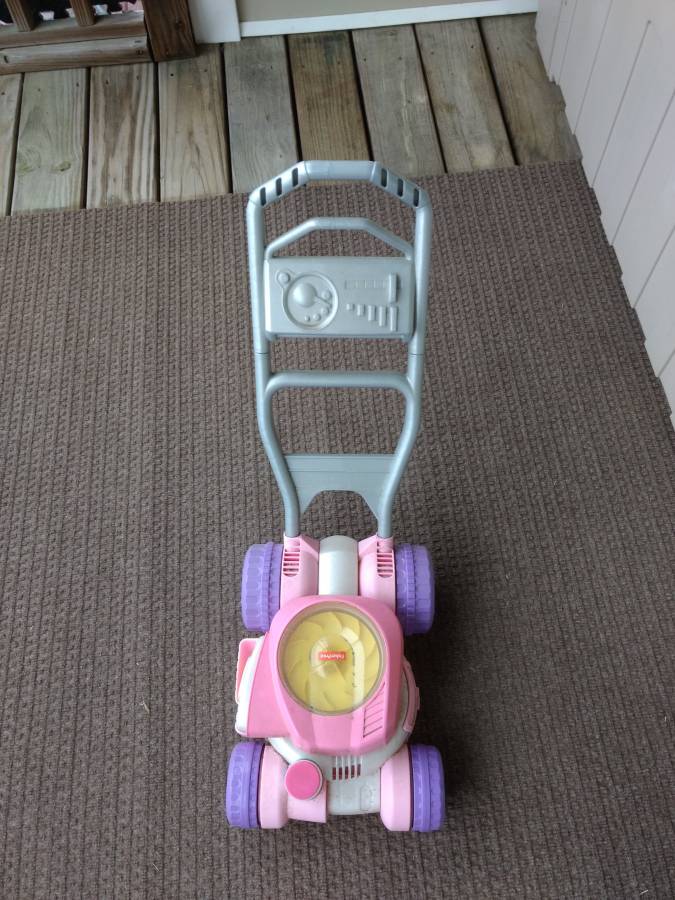 The mower also seems to be very durable. This is important not only because my daughter has a tendency to abuse her toys a bit but because our yard is full of things like tree branches, apples (from our apple tree) and rocks that would tear a lesser toy to shreds. It’s also very realistic. The bubbles that come out of it come out of the side rather than the top. It makes it look like she really is mowing the grass.