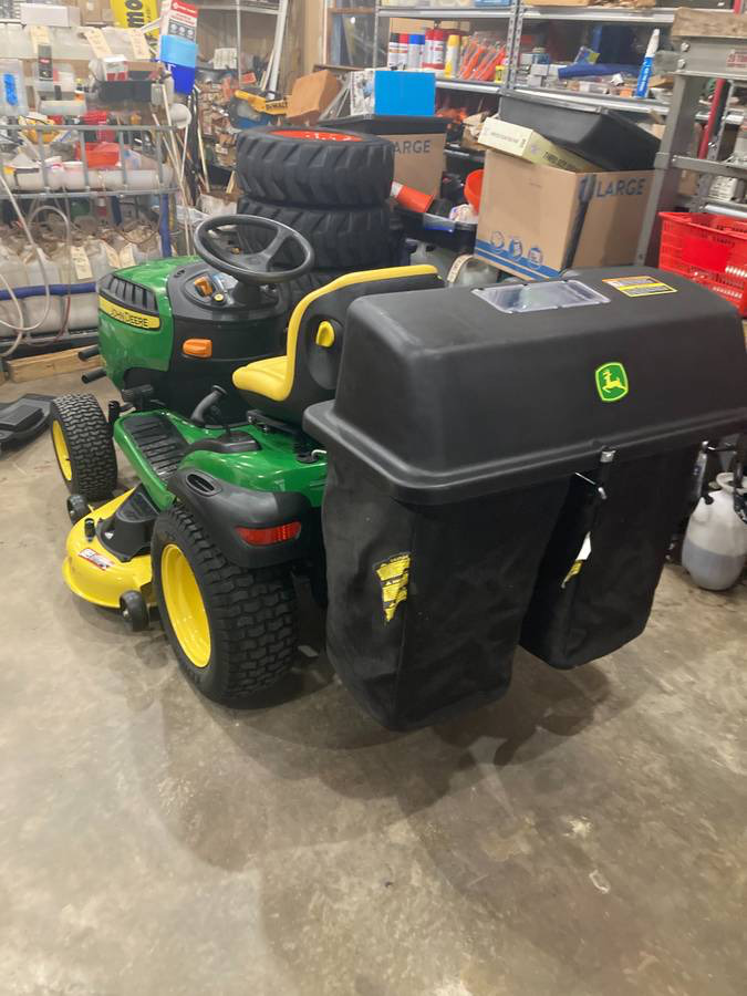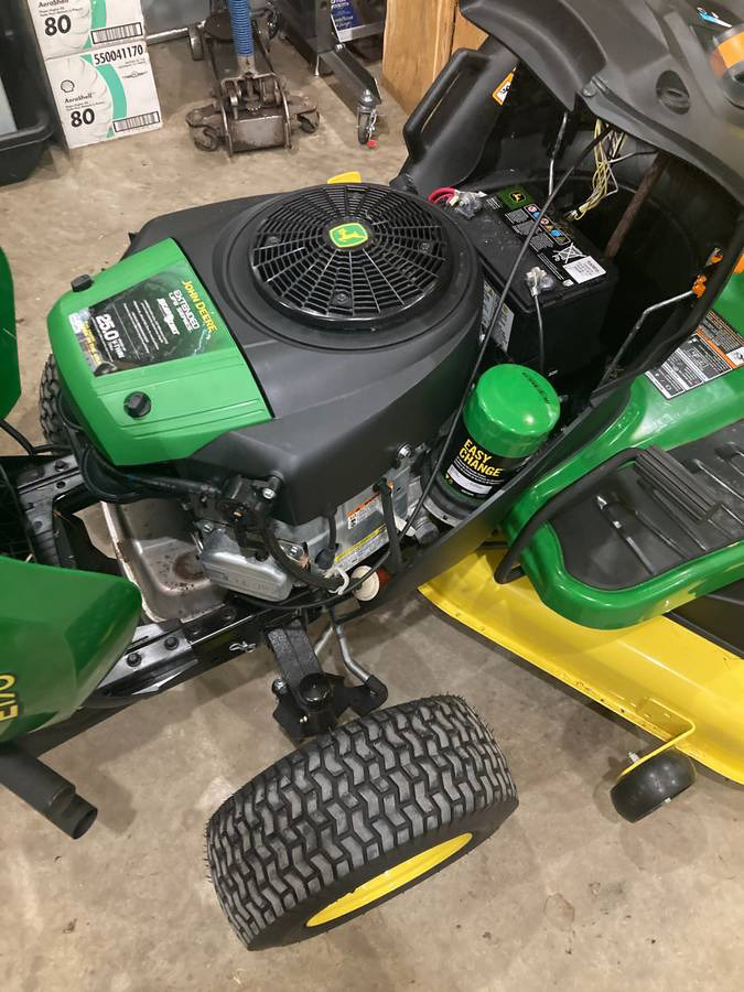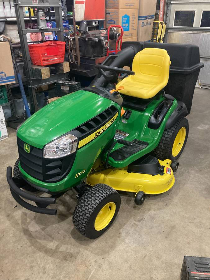 I wanted to let you know that I have a John Deere E170 lawn tractor with a twin bagger attachment that has been very well taken care of. It has only been stored in a garage and has a low 35 hour usage. The tractor has an automatic transmission and a 48” cut with commercial gator mulching blades already installed. All the grease points on the suspension and mower deck have been recently flushed and filled with high-quality Drydene EP premium grease that will last a long time.