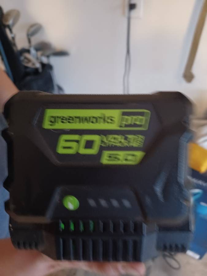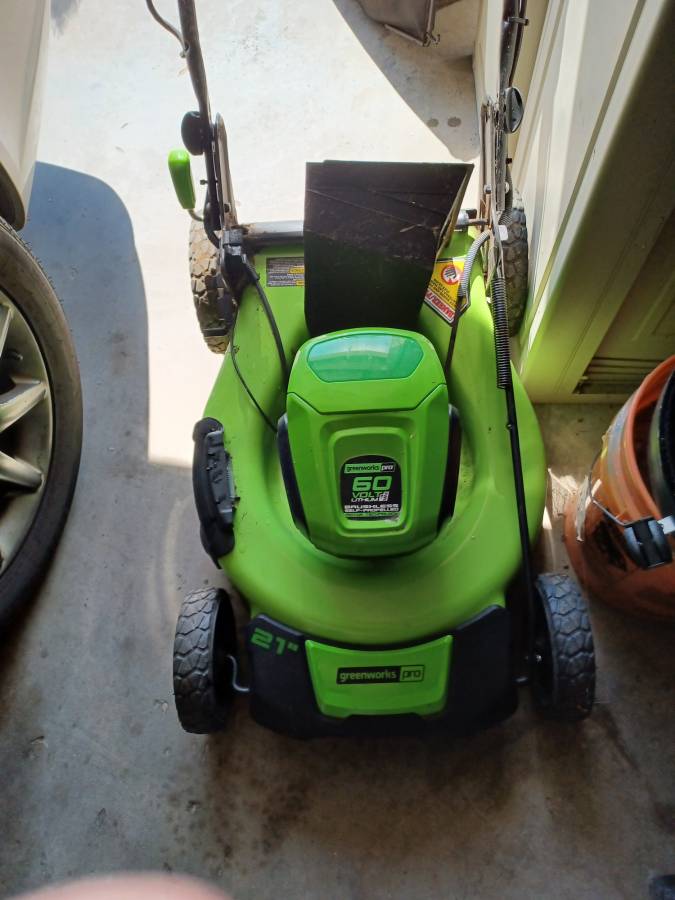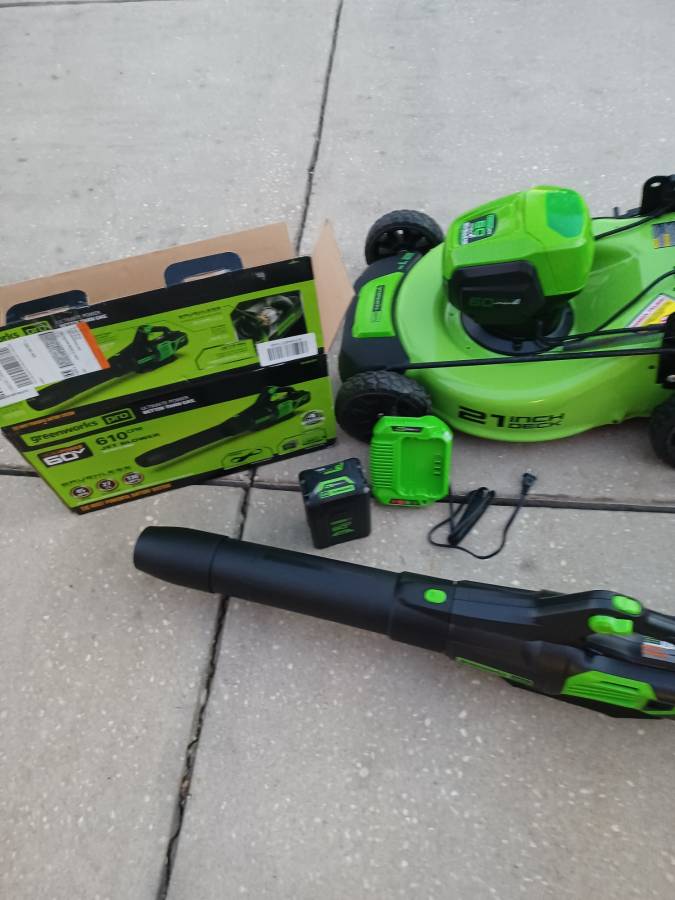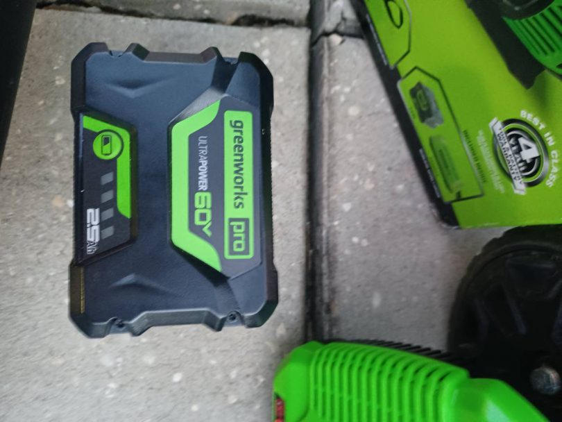 Greenworks Pro 60Volt Battery Lawn Mower self-propelled with grass catcher in excellent condition. At Home Depot, I purchased a new 60-volt blower, a new battery, and a new charger. I’m fully charged and ready to go.