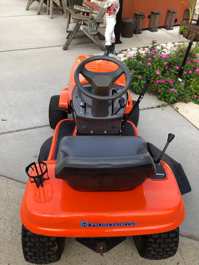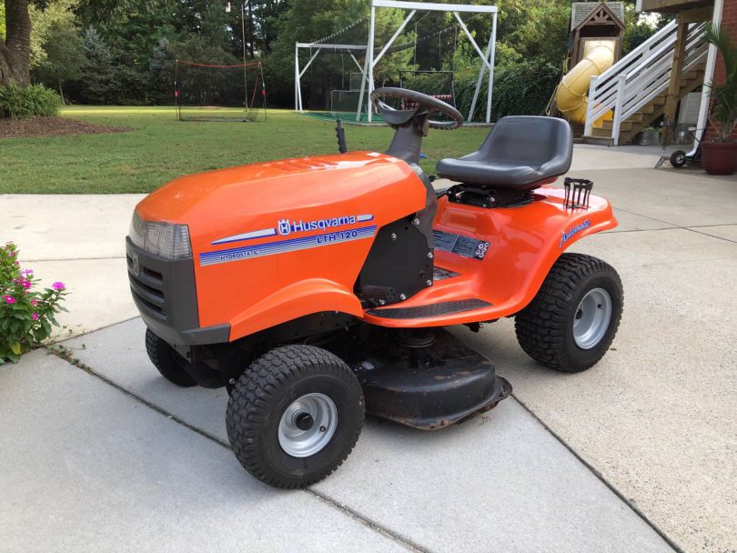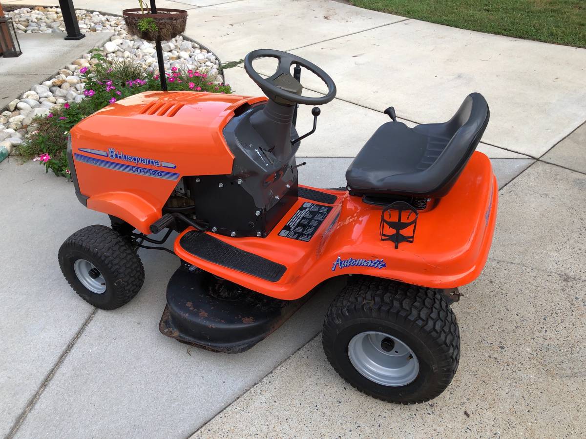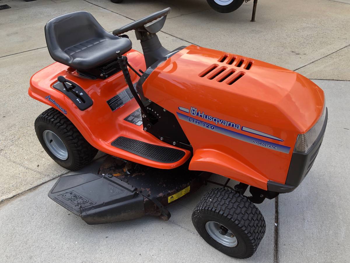 Preowned Husqvarna LTH 120 Riding lawn mower Starts, runs and excellent cuts. This is a hydrostatic model, no need to mess with slow gears. Just got a tuning. 38 “cut, ideal for an acre or less of land and sliding through narrow spaces such as fence gates etc. The cutting deck, like Most Incur, has ordinary rust on top, but that’s about it, mower looks good and works fantastic.