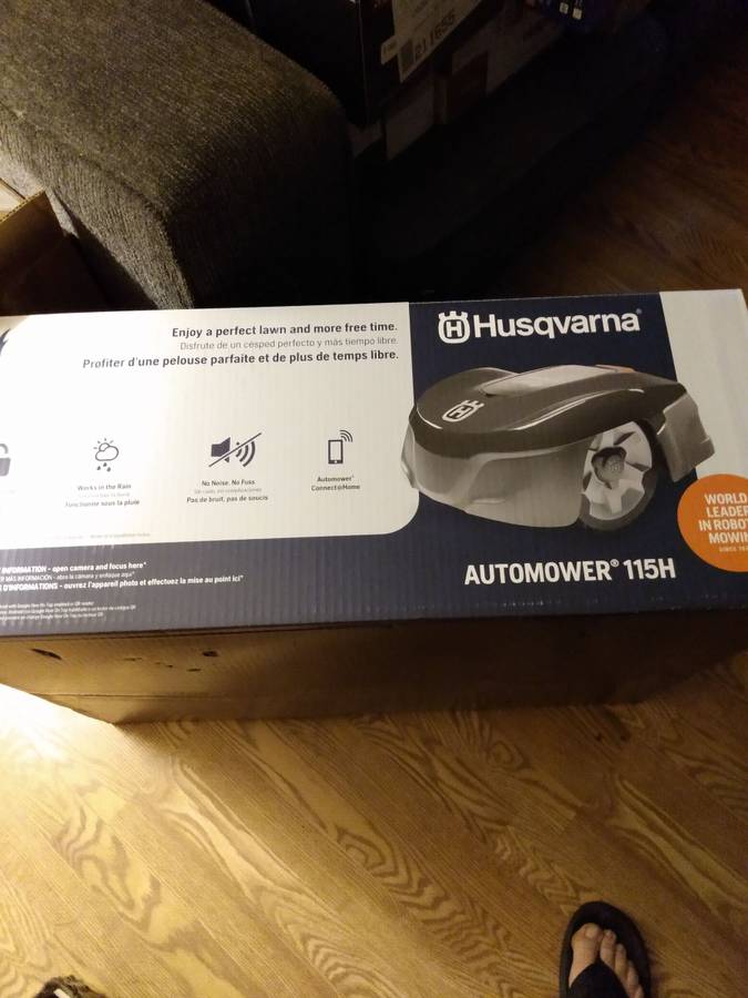Husqvarna Automower 115H, new in the box. It comes with a charging station and an installation kit. Paid $1199 plus tax and sold for $899. To achieve healthier grass and a perfect lawn, Husqvarna robotic mowers use an intelligent mowing cycle. Automower 115H is ideal for small to medium-sized yards and can navigate objects and 17° slopes. It also produces excellent cutting results in less-than-ideal conditions. The maximum cutting height is 3.6 inches. Lawn Care in the Future – To maintain a carpet-like appearance, the Automower 115H cuts less grass more frequently. It can mow for up to 60 minutes on a single charge before returning to its charging station. It is simple to set up this smart lawn mower. You can also control it with a few finger taps from your smartphone.