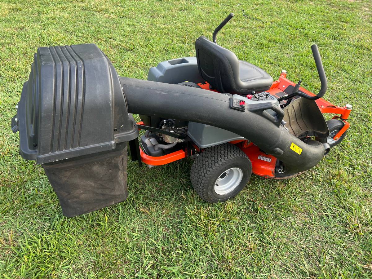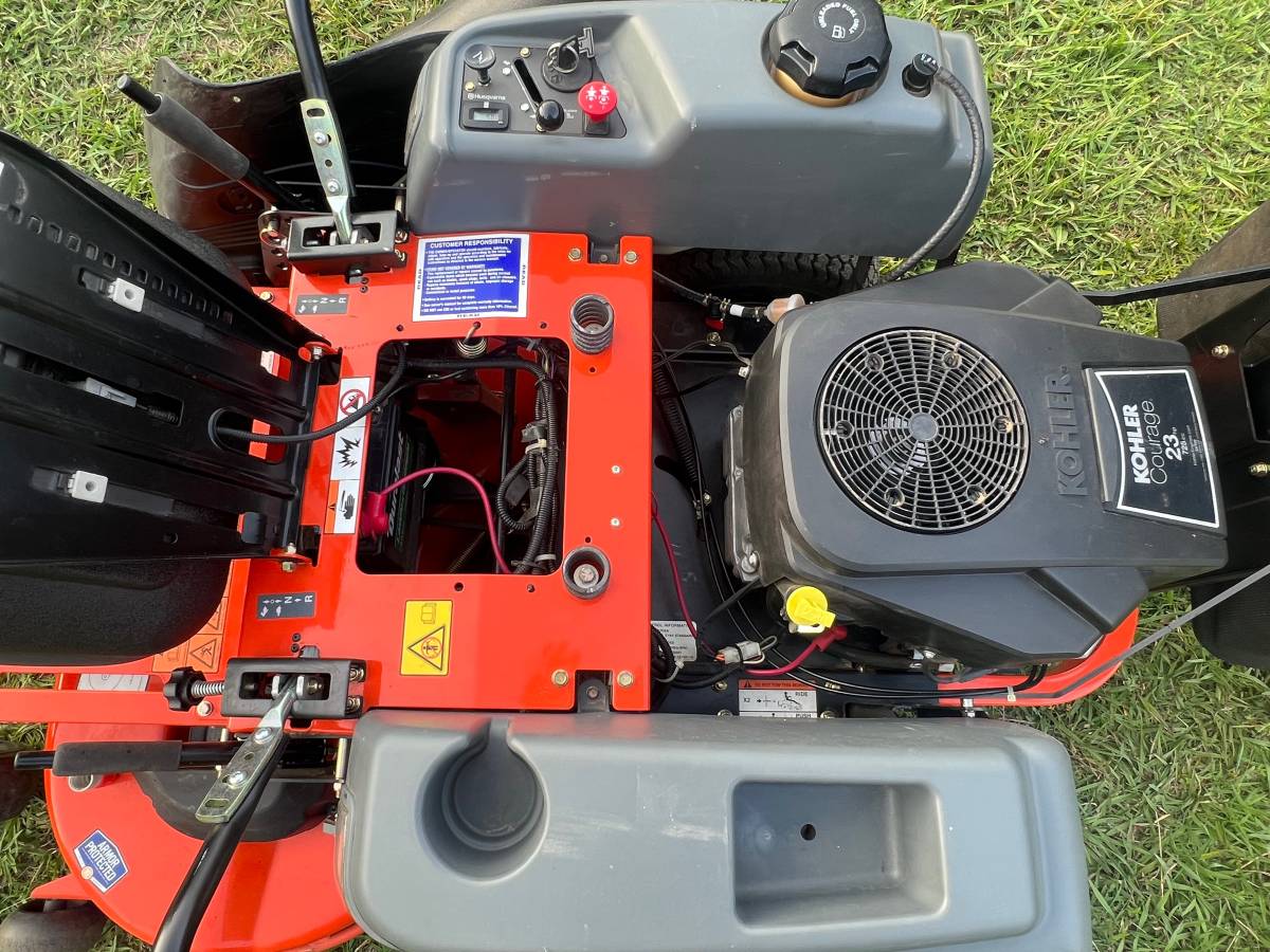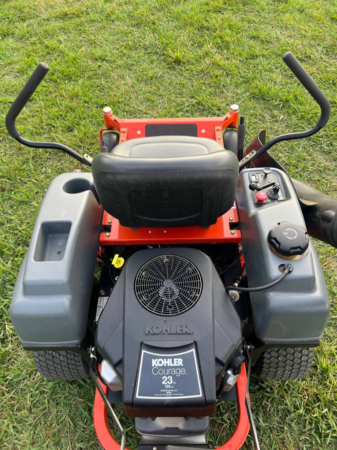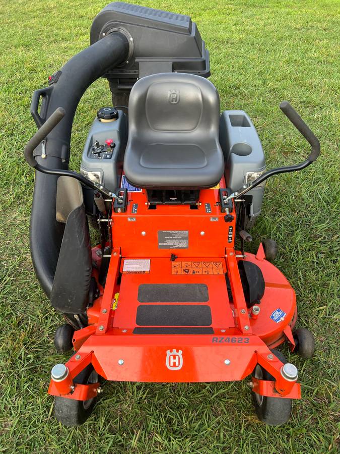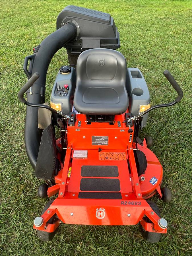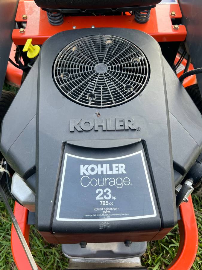 The mower operates and mows as if it were brand new. It is in excellent condition and has been well-maintained. It comes with a bagger and mulching kit, as well as a new battery. Its specifications include a 46-inch cut with the Model RZ4623, equipped with a 23 horsepower Kohler engine and only 50 hours of usage.