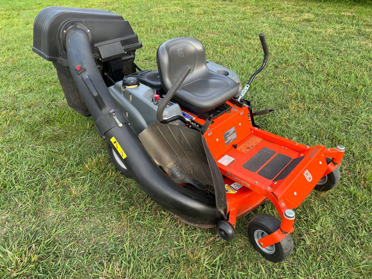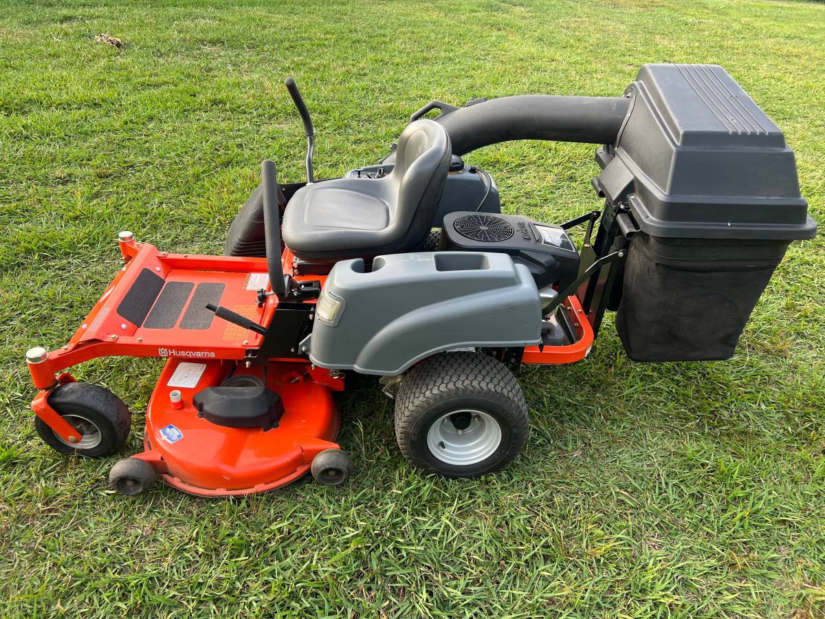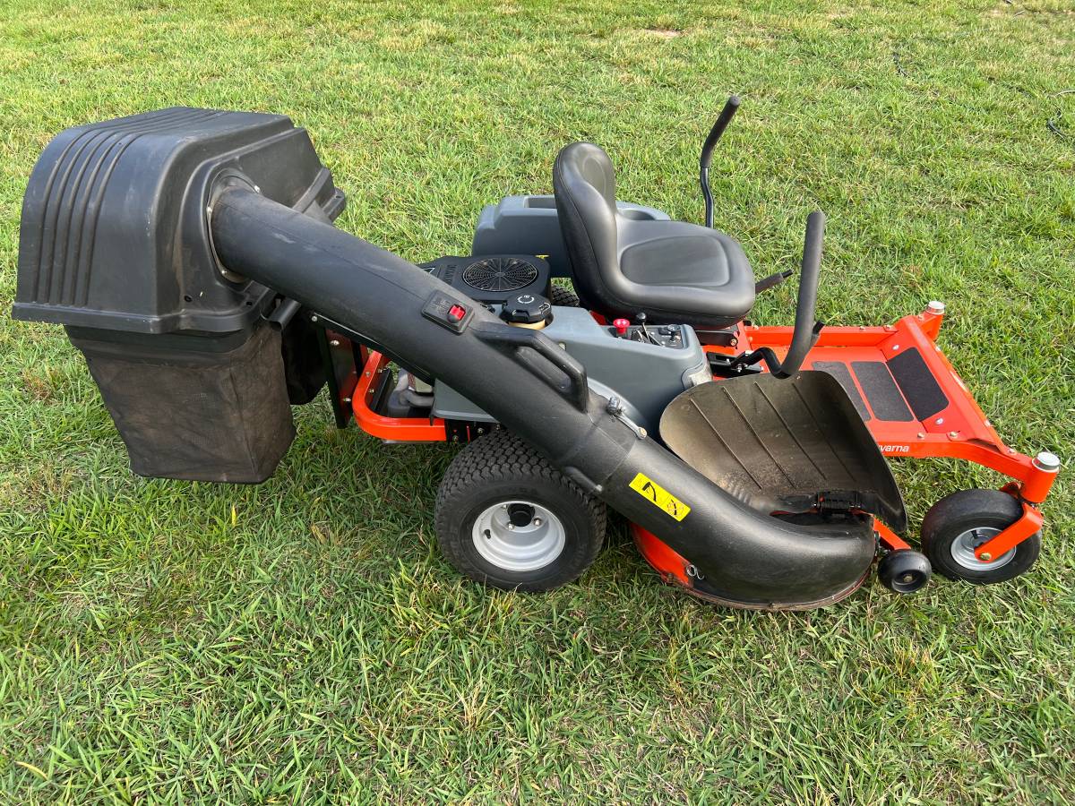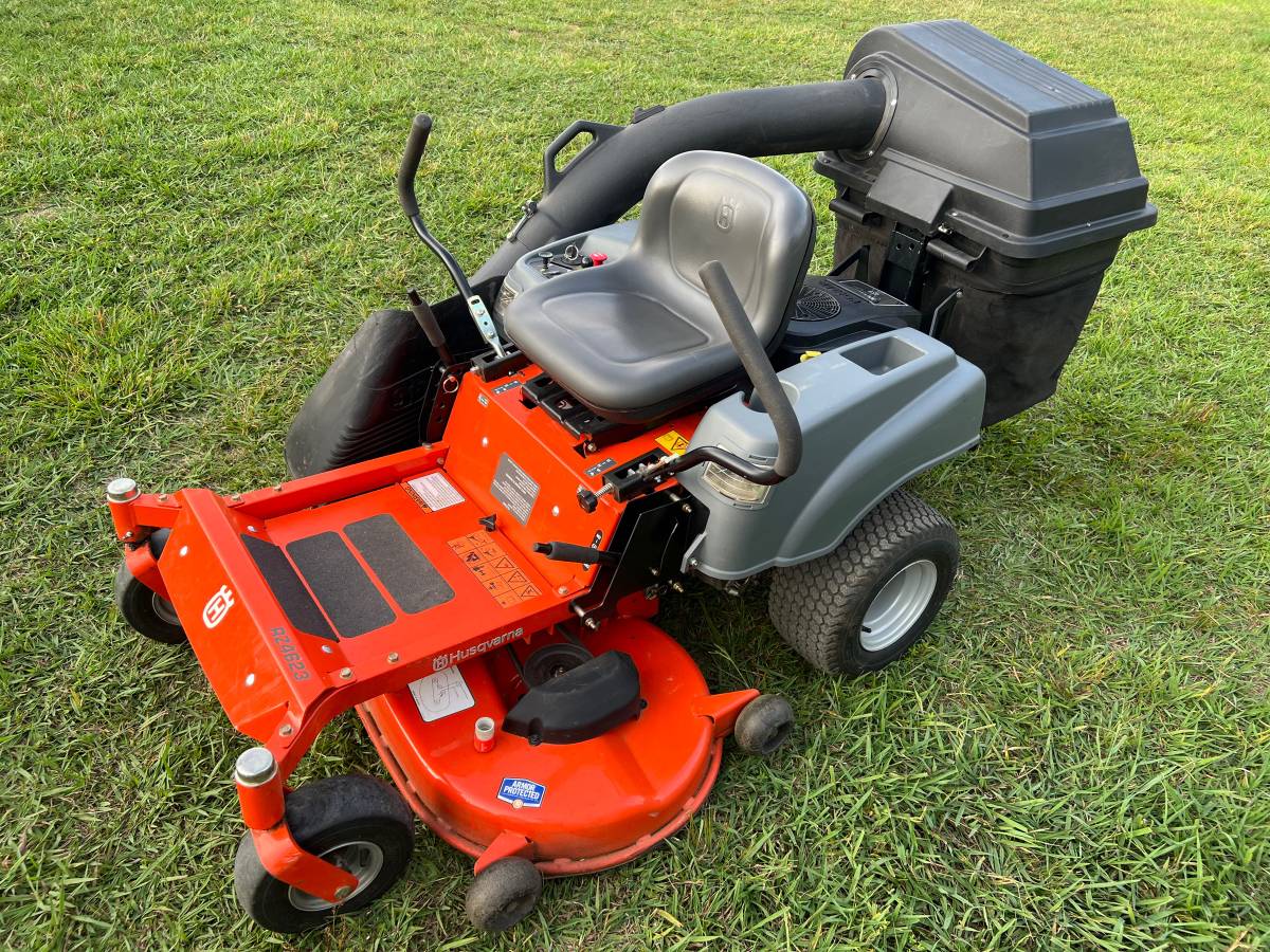 The mower operates and mows as if it were brand new. It is in excellent condition and has been well-maintained. It comes with a bagger and mulching kit, as well as a new battery. Its specifications include a 46-inch cut with the Model RZ4623, equipped with a 23 horsepower Kohler engine and only 50 hours of usage.