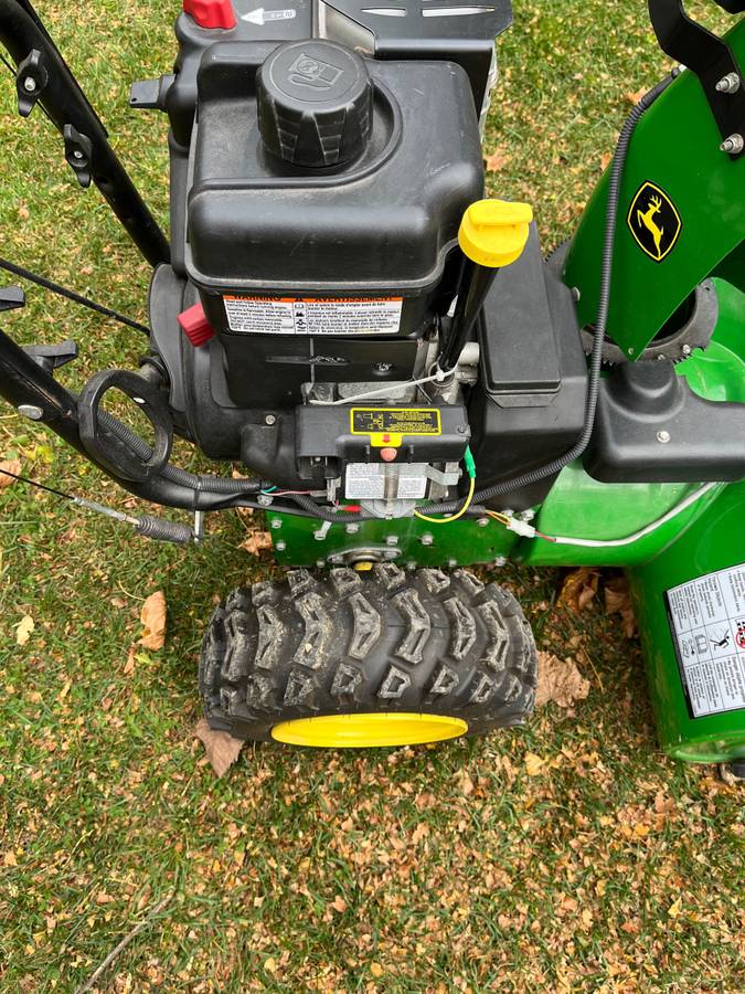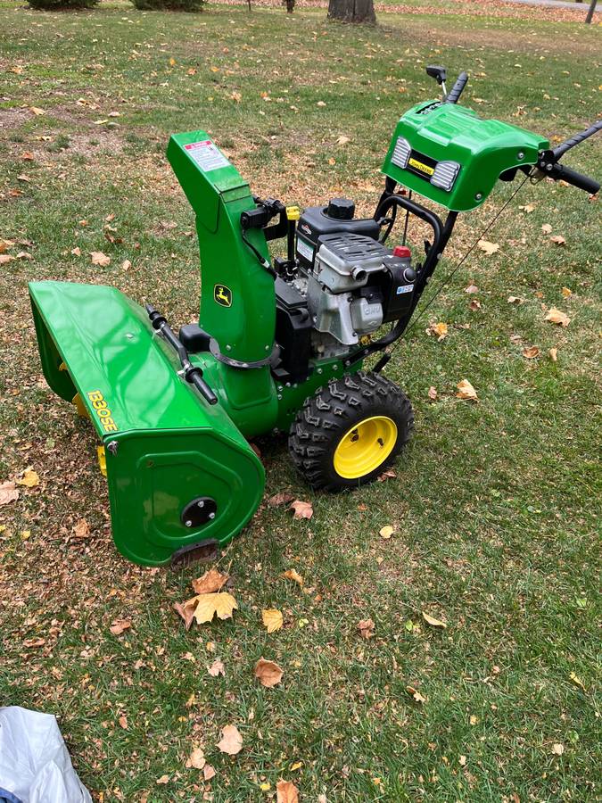 For sale is a John Deere 1330SE snowblower. 342cc electric start motor with heated handles and a power chute lite. Since this John Deere 1330SE is larger and more powerful than many of the other snow blowers in this series, it has a larger fuel tank that holds 4 quarts of gasoline. The JD 1330SE is very easy to use, thanks to a number of key features such as an electronically operated chute deflector that can swivel through 200 degrees by electric switch, which is even better than the old model’s joystick, and heated handles, which means that operating this model for long hours will not result in frozen hands! It is in like new condition, has only been used a few times, and is asking $1300 or best cash offer.