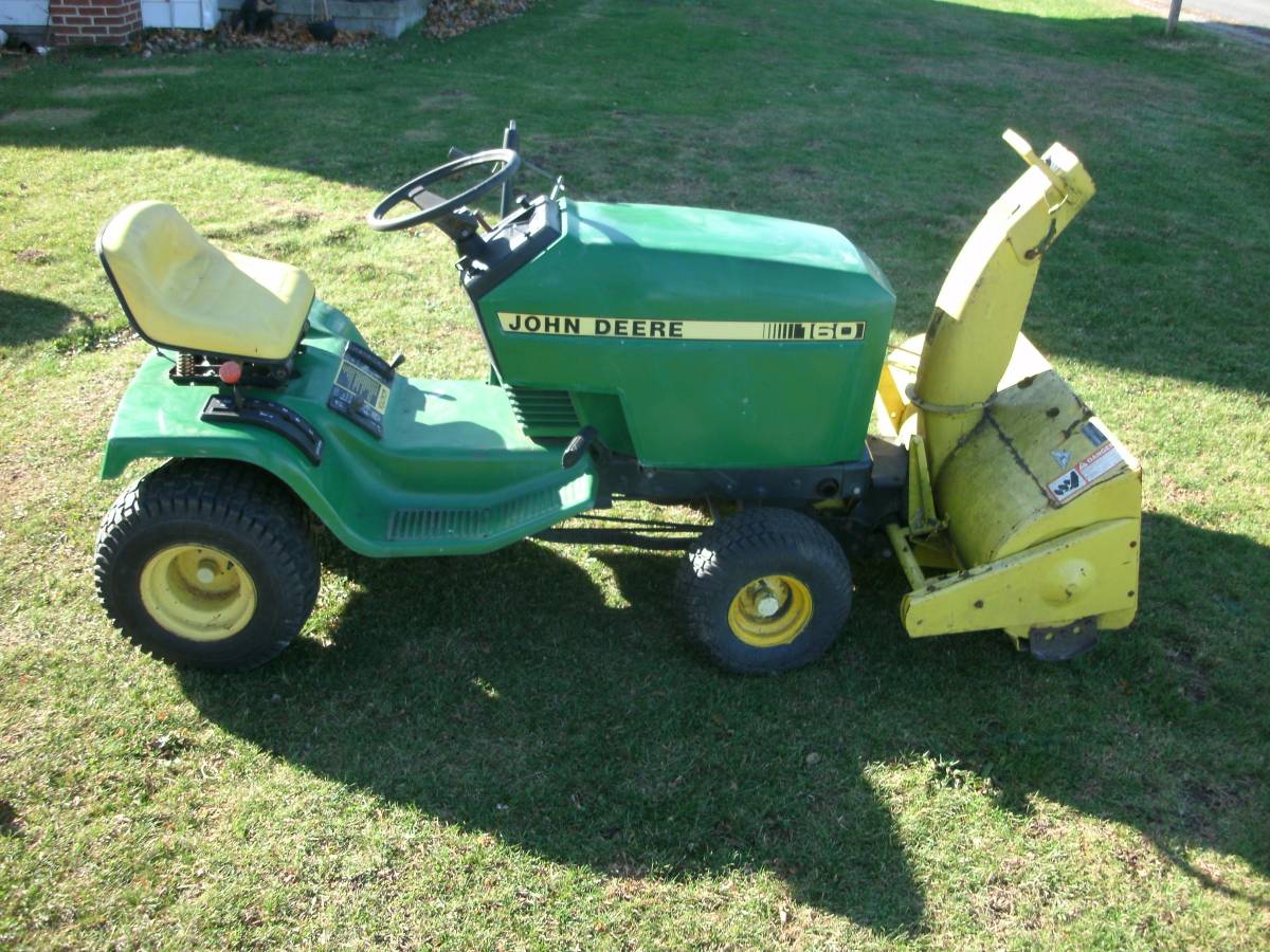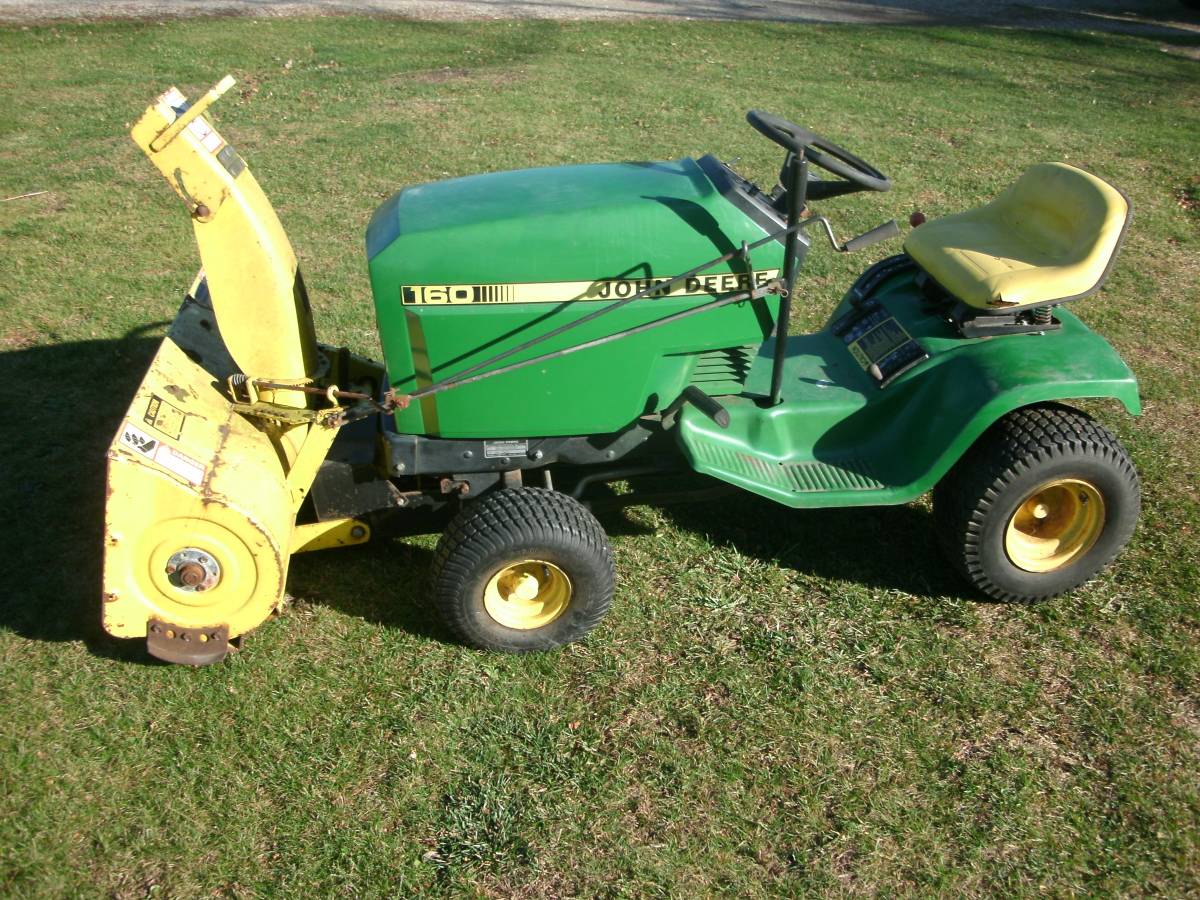 John Deere 160 riding mower lawn tractor with snow blower in great condition. Recently tuned up and oil changed. This mower runs and operates smoothly. Mounted chains of rear tires after taking photos. It also comes with a 38-inch mower deck. Used it to mow the big mow withy last season.