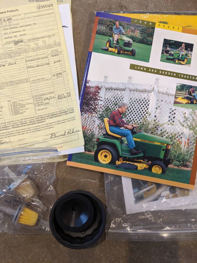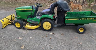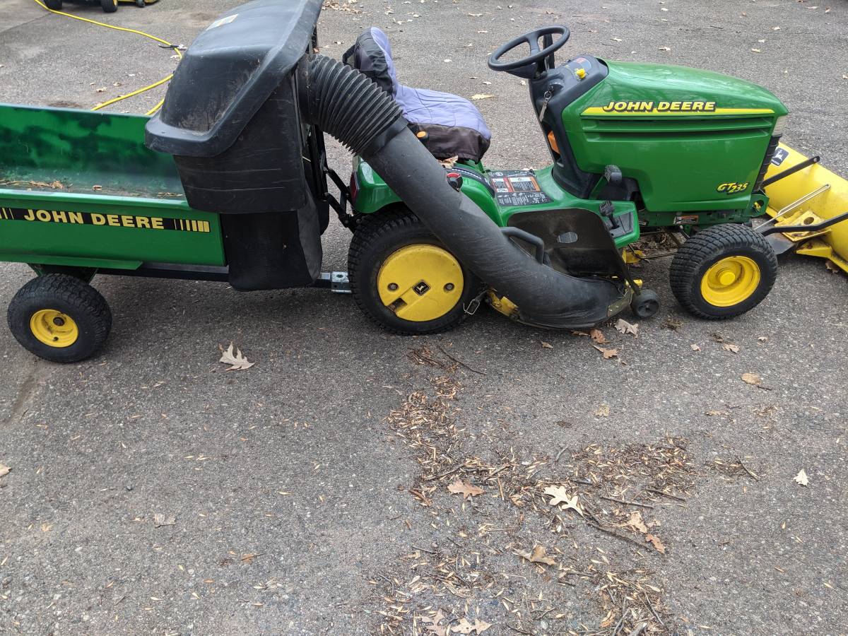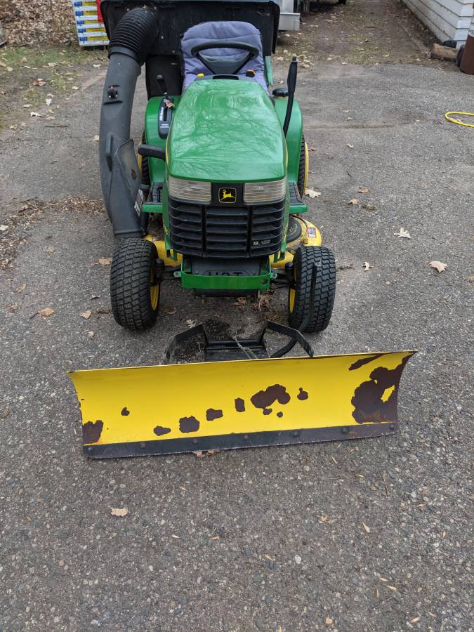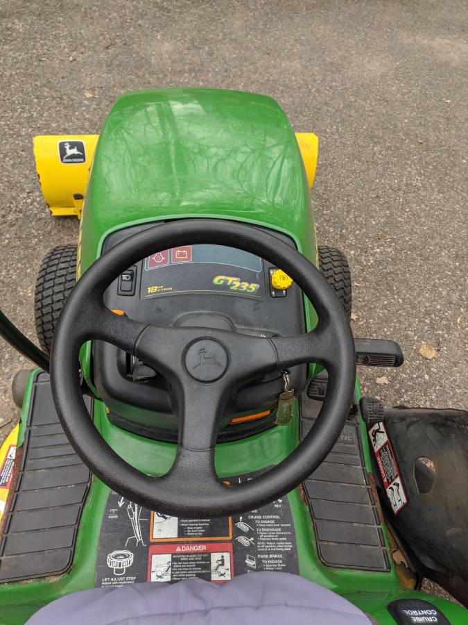 John Deere GT 235 is available for sale with 18hp engine, snow blade, tire chains, wheel weights, bagger and yard cart. Only reason to sell is to switch to a zero-turn. Runs great, easy to swap from 48 “mower deck to snow plow. Original documents included, with spare fuel filters, oil filter wrench, etc. Lawn cart could use new tires, you won’t take air, you need to fill it periodically. Honestly, I haven’t used the cart since I bought a Ranger 3 or 4 years ago. Ready to go for snow removal this winter!