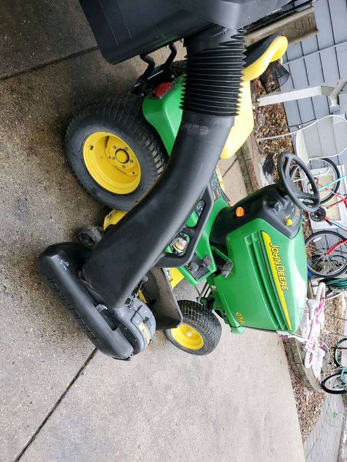 Very nice, well-kept John Deere GX255 lawn and garden tractor with power steering and a differential lock for the rear axle. It has a brand-new John Deere powerflow twin bagger system.