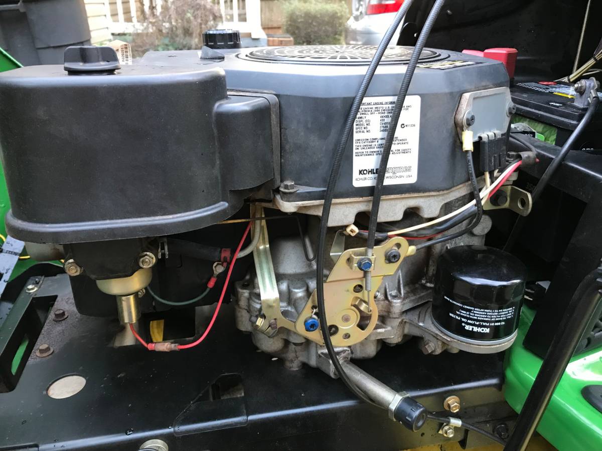 The John Deere L110 is powered by a one-cylinder Kohler engine that generates 17.5 horsepower. This overhead-valve engine is lubricated at full pressure and has a spin-on oil filter. The 2.1-gallon fuel tank is located at the mower’s rear. This mower has a one-level choke system as well as a 15-amp regulated charging system.