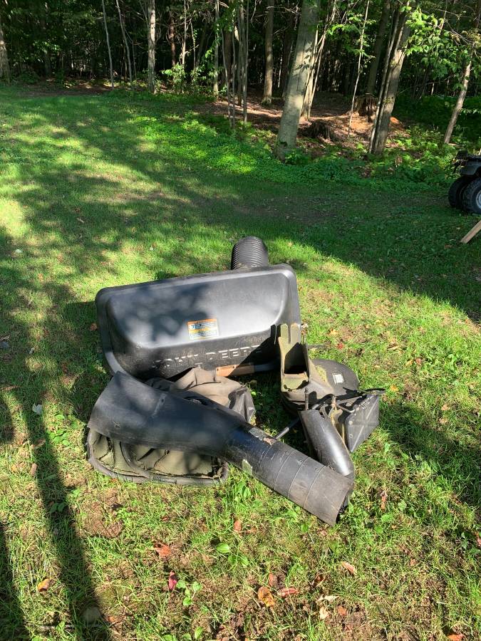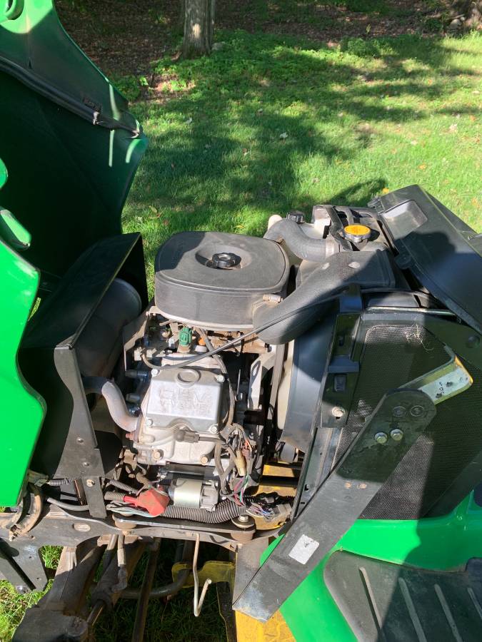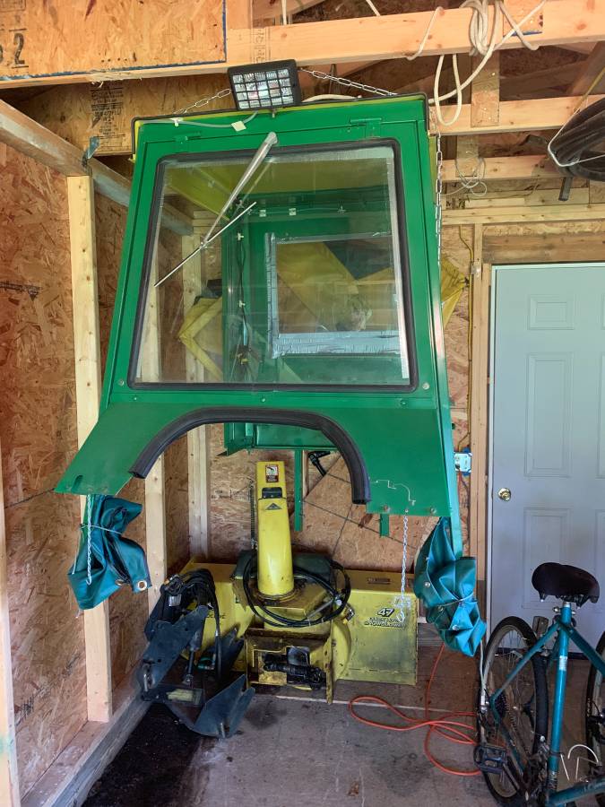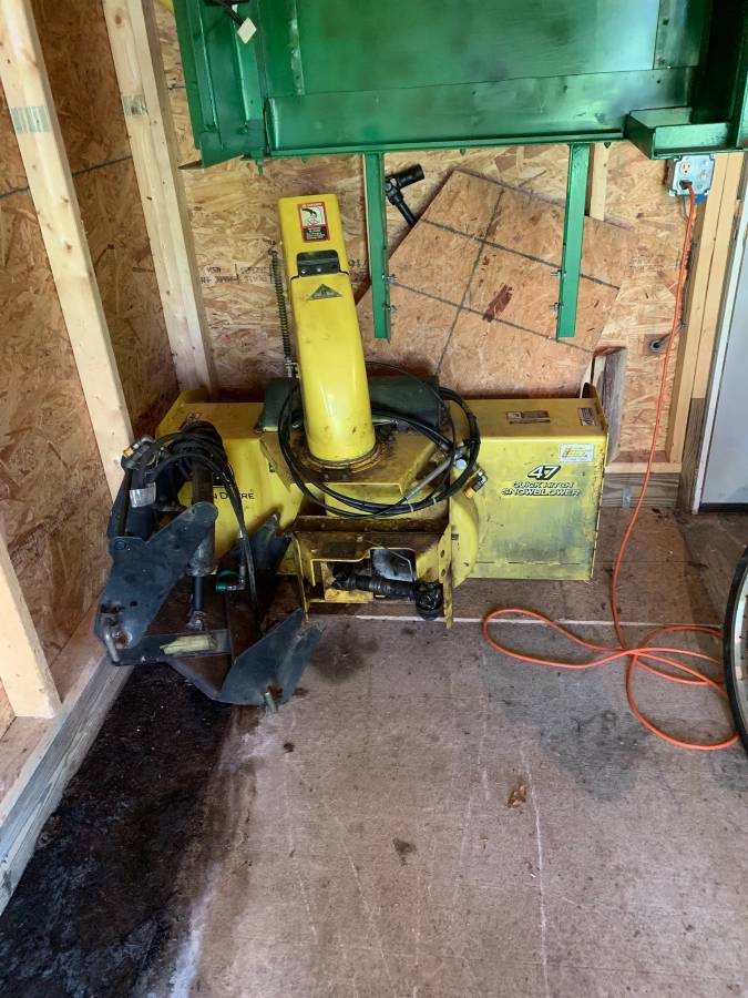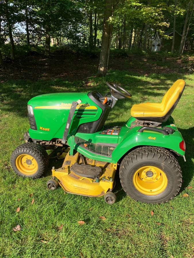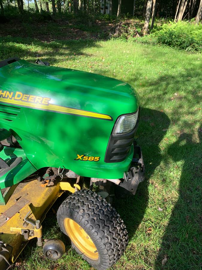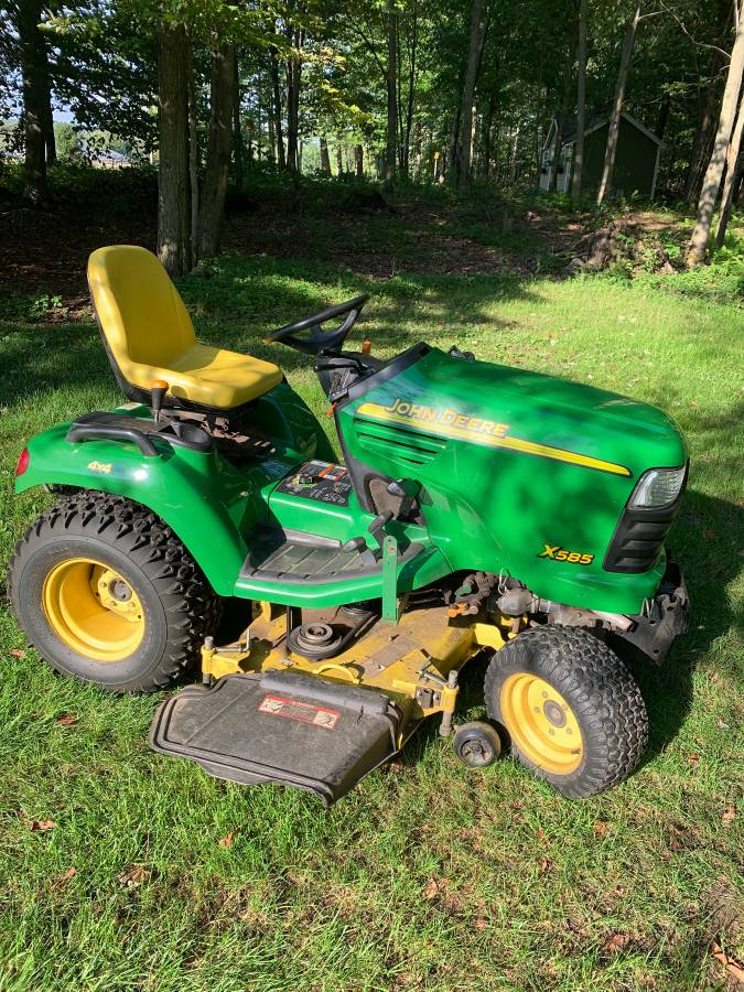 Used John Deere X585 4×4 lawn tractor equipped with 25hp Kawasaki engine only 710 hours on it, power steering, turf tires Always stored inside Includes: 54in mower deck, 47″ two-stage snow blower, lawn vacuum system, hard cab enclosure.