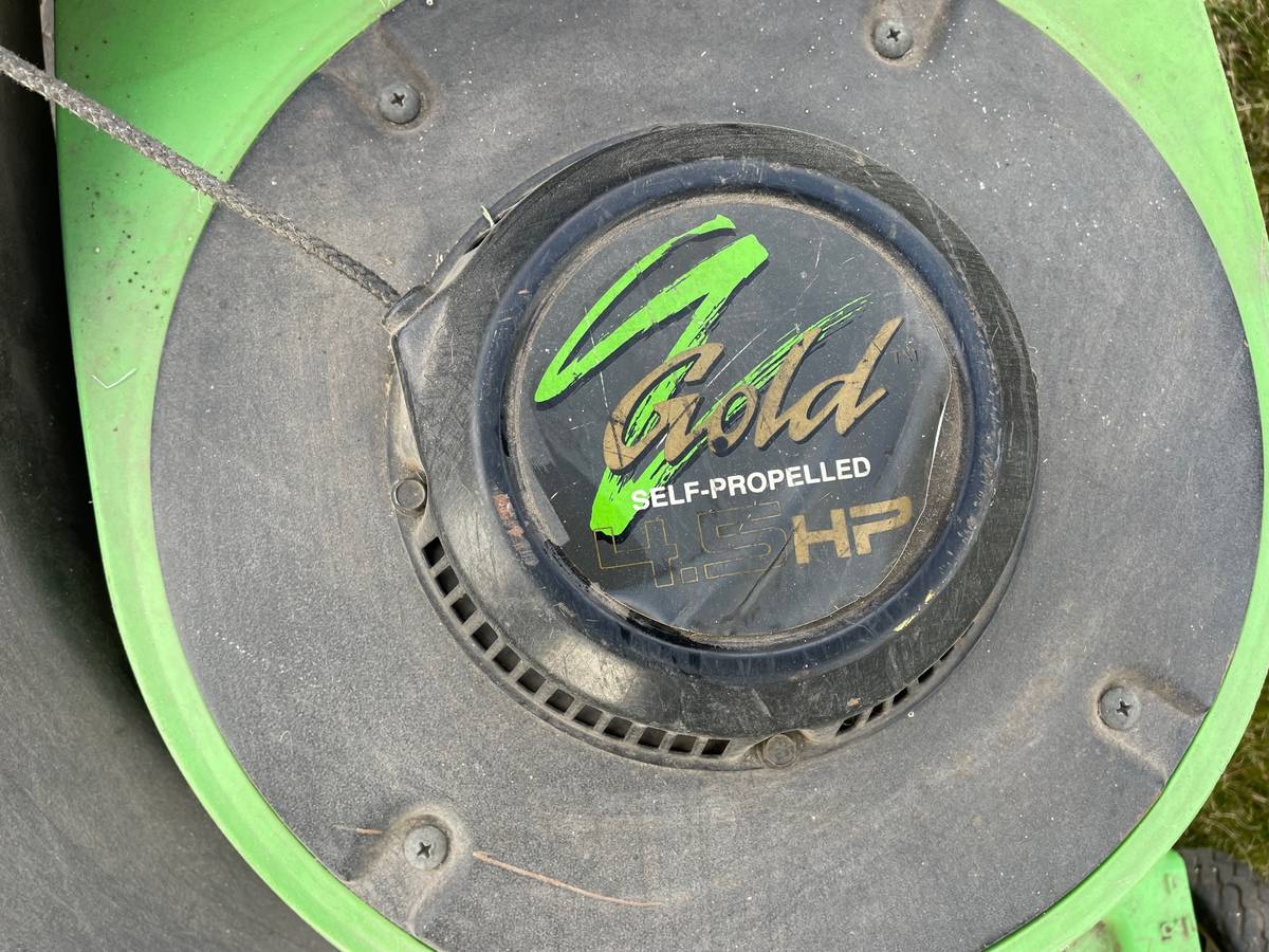 Lawn Boy Gold Series self-propelled 21″ mower with 3 speeds, side discharge, mulching cover plate, and rear bagger. The self-propelled feature has three different ground speeds. 2-cycle engine with 4.5hp. Chassis made of aluminum. The cover plate for the side discharge is included but not shown in the picture. It is quieter than most other brands due to the large muffler underneath. Owner’s manual is included.