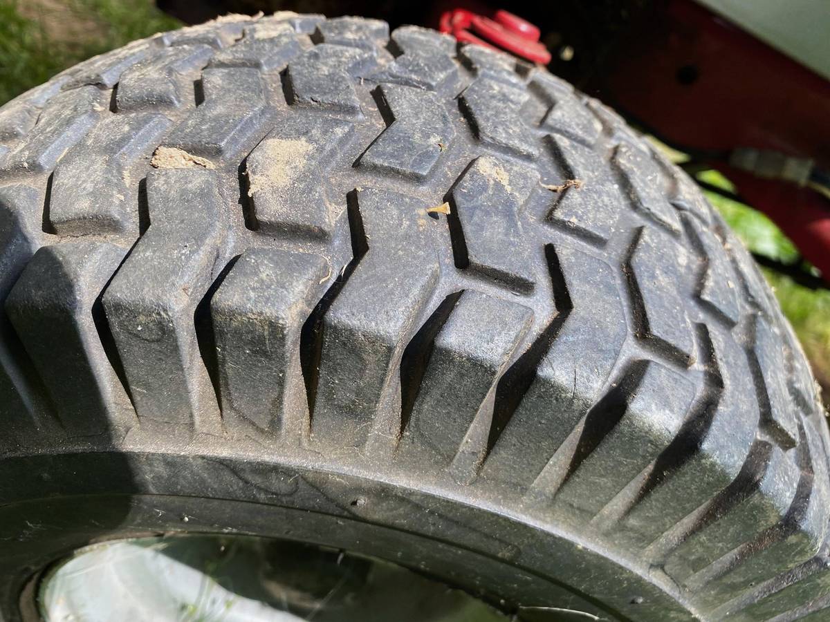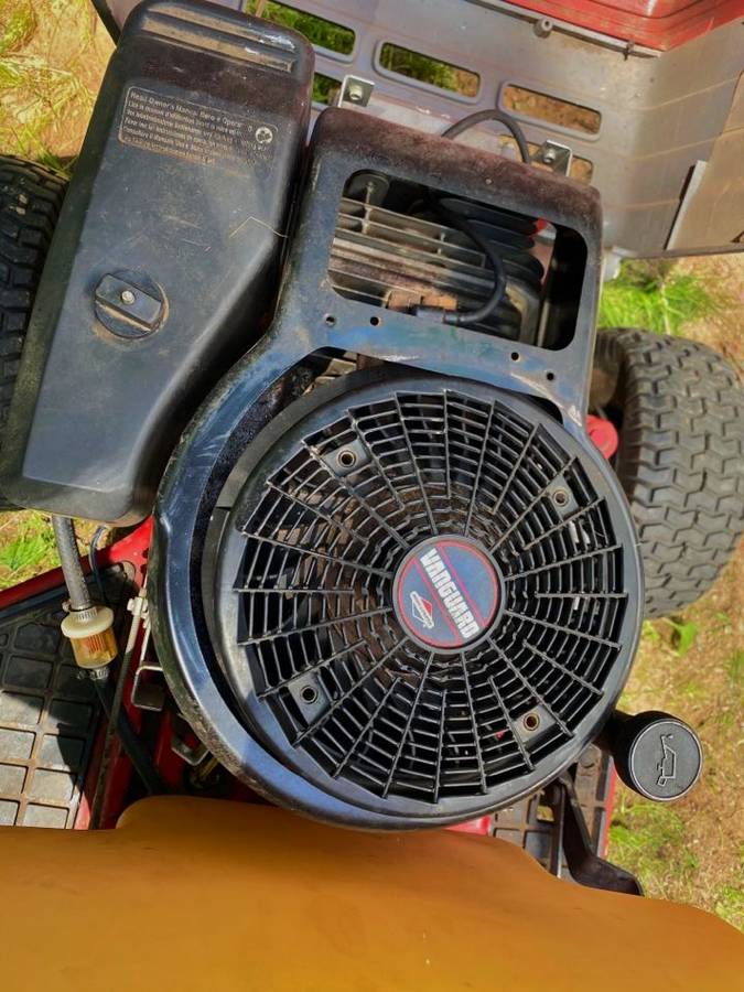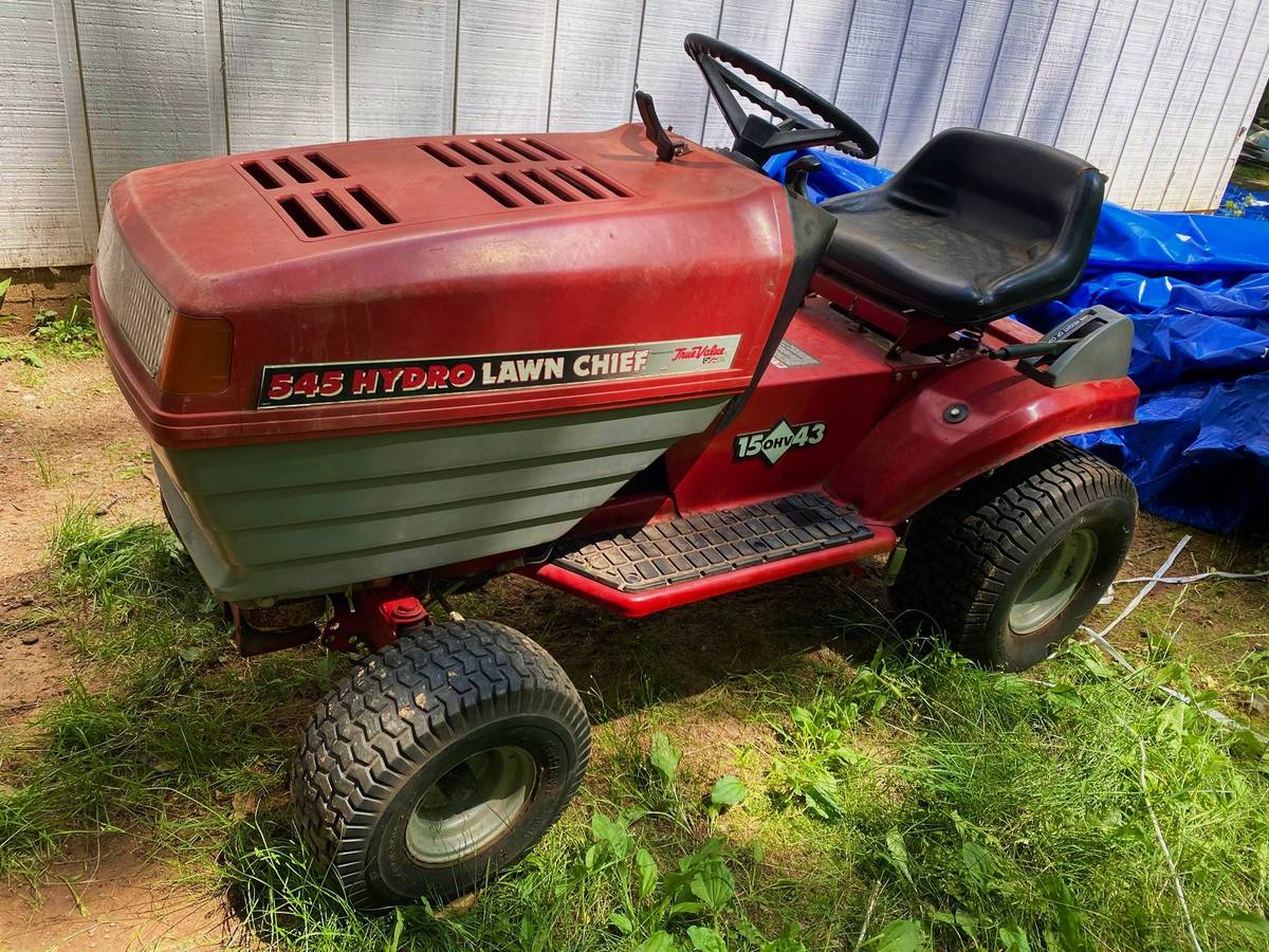 Lawn Chief 545 Hydro Riding Mower needs work to get it moving, was stored within its entire life it had 136 hours on it, just got it in and tried to start it, so far I’ve replaced the gas lines cleaned the tank, the engine turns over so you can tell it has good torque at the stroke level, 15 HP OHV brigs and stratton engine. The mower deck there was a deck, but it’s all stripped down, but it’s strong not rusted out, trying to fire it with no success yet as it’s going through the wiring and having a clicking noise so far but doesn’t turn over, the engine turns over by hand, I could try to pull it off, but it’s got really good compression so I don’t know how to pull it off. no key I can see he used a screw driver the ignition turns over with a screw driver, 2 tires need to be sealed up again they came off the rim but the tires are not dry rotted at all there in great shape, would make a cool riding mower to ride around in.