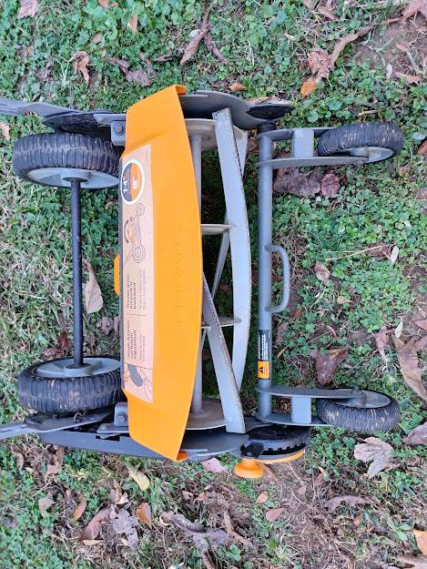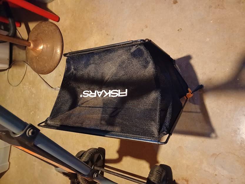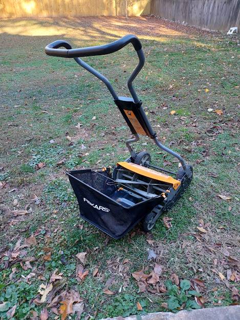 like new Fiskars Stay Sharp Max Reel Mower for sale. Lowes charges $209 plus $40 for the trimmings bag, plus tax. Nice and sharp, but only used a few times. The Fiskars Stay Sharp Max Reel Mower has advanced technology that delivers best-in-class cutting performance without the use of gas, oil, charging, or cords. This advanced design is 60% easier to push than other reel mowers and has twice the cutting power. Furthermore, a Stay Sharp Cutting System eliminates the expense and inconvenience of manual blade sharpening. The cut height is easily adjustable from 1-4 in., the inset wheels allow for ultra-close edging, and the one-touch handle height adjustment improves comfort and control.