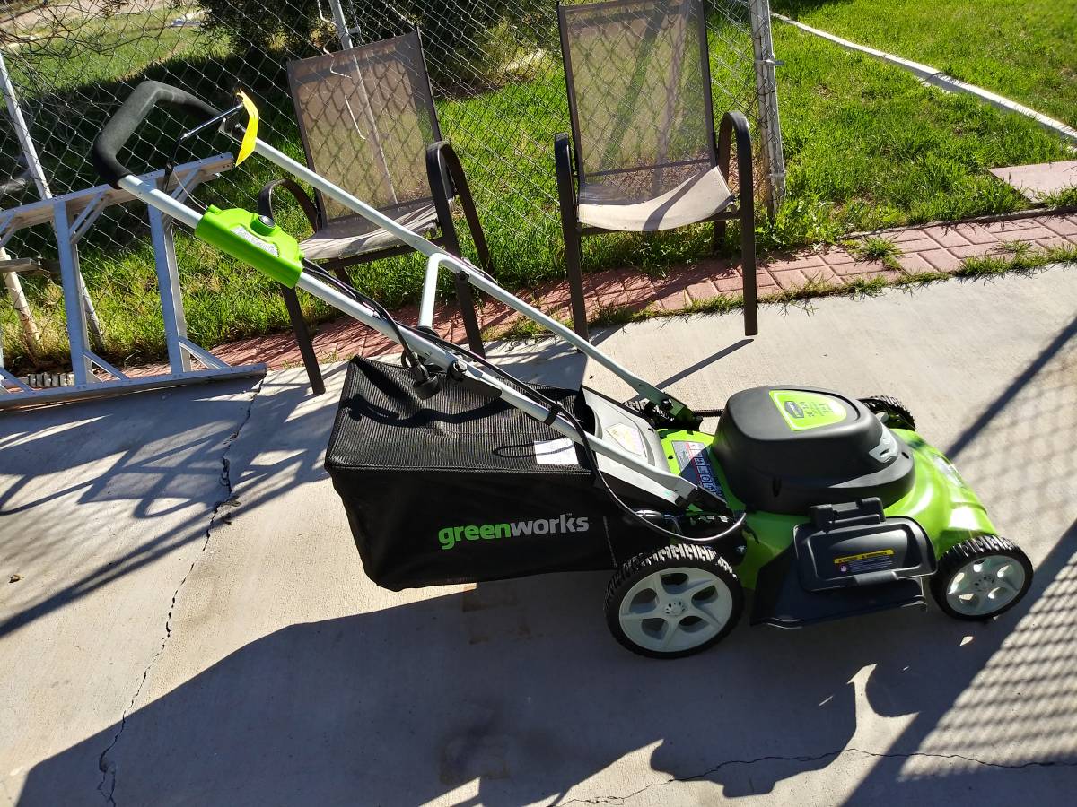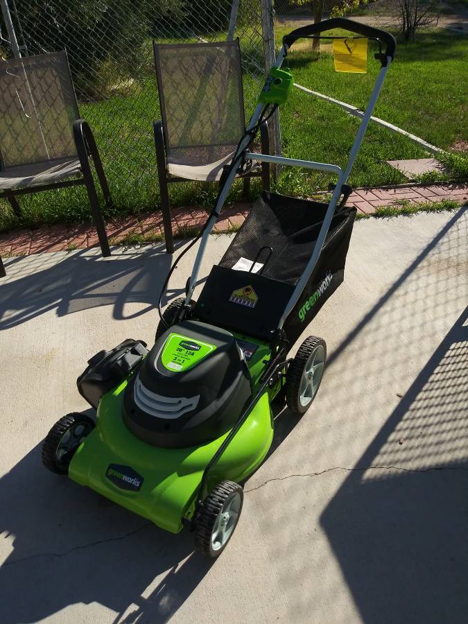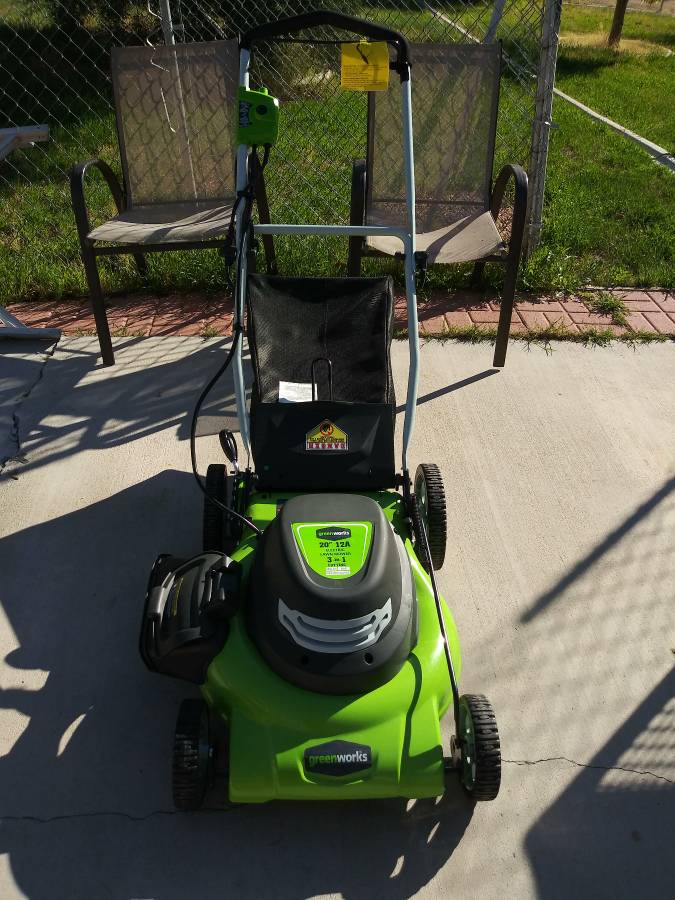 Up for sale is a like new and never used Greenworks 20-Inch Electric Corded Lawn Mower Model # 25022. This electric mower features:3-in-1 mowing capabilities-mulching, pick at rear and discharge at hand. 20in. Wide cutting route provides a great combination of maneuverability and flexibility for mid-sized areas. Powerful 12 Amp motor provides extreme cutting and mulching power. Rugged cutting deck with stamped steel offers additional toughness. Adjustable cut height from 1.5 in, with 7 different positions. Till 3.75 in.. Cam lock handle to make the unit easy to fold and store. Integrated cord lock helps to prevent unintended disconnection of cords. Ideal for yards and lawns medium in scale.