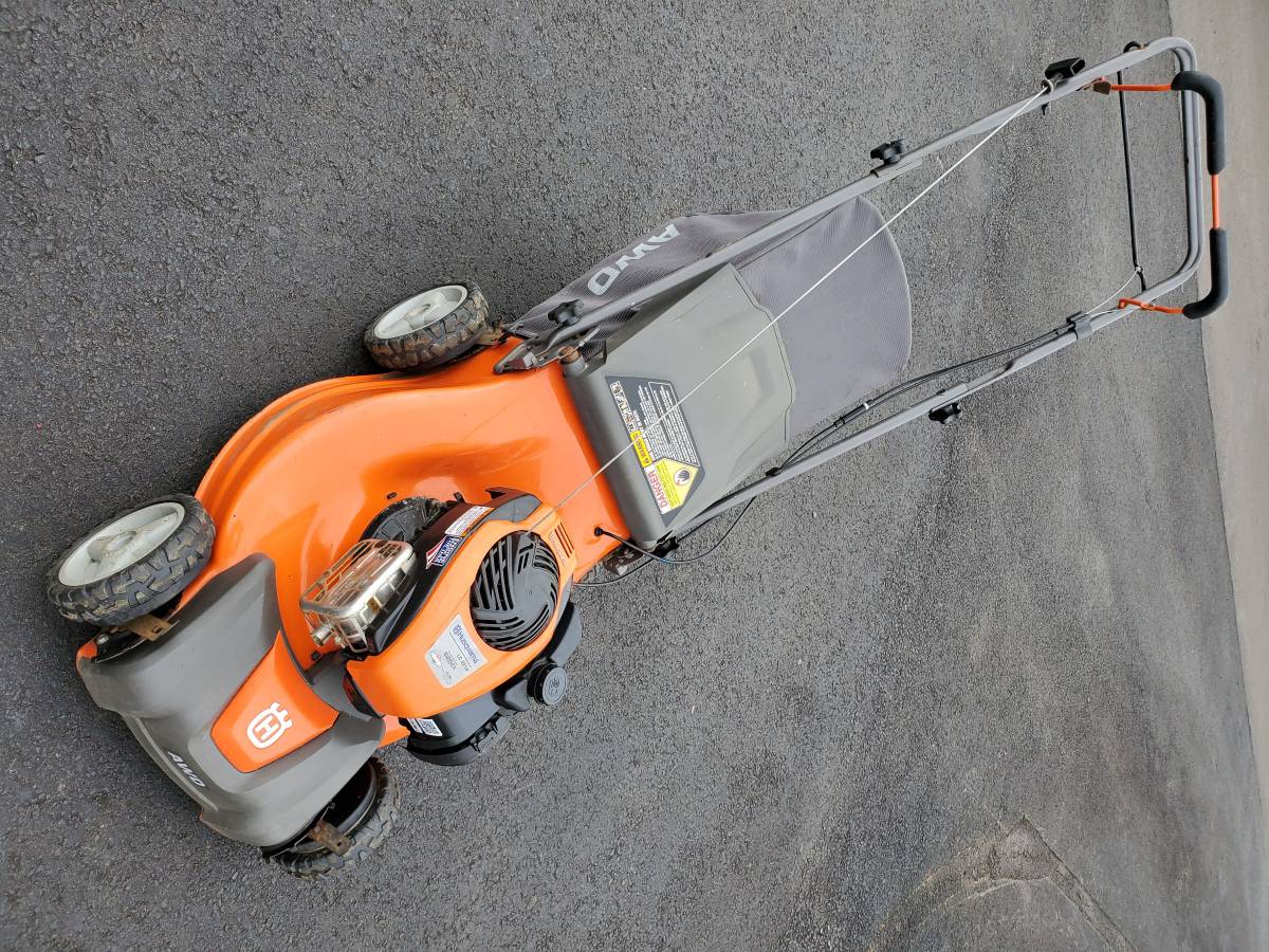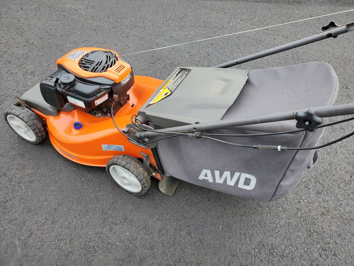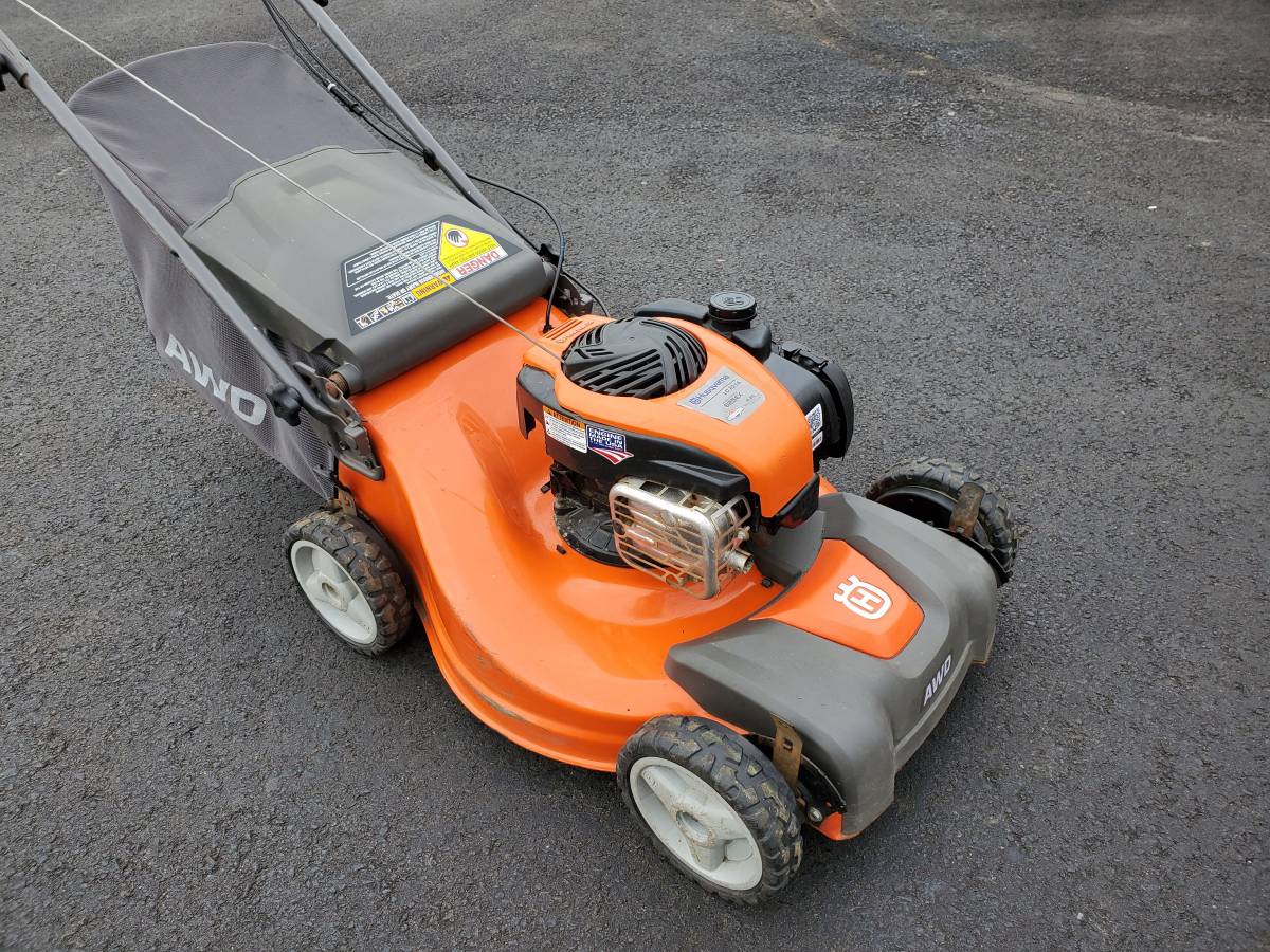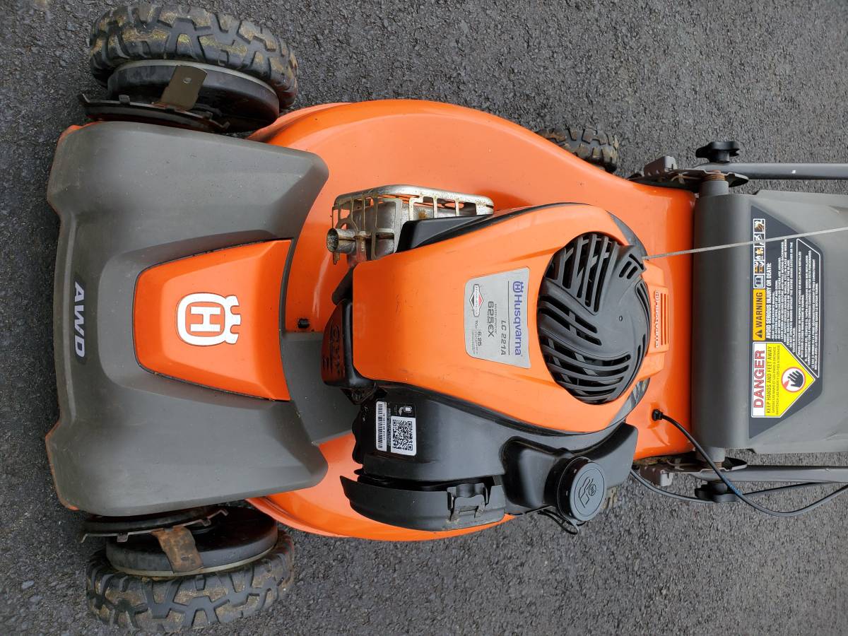 21 inch AWD Husqvarna LC 221A Lawnmower in pristine condition with 150cc 6.25 motor brigs. This is an AWD (all wheel drive) walk behind mower. All-Wheel-Drive provides stability in rough, slippery and wet areas and on slopes. In all turf environments, on pavements and off-road, the effect is maximum traction and superior performance. The machine also makes sure there is minimal damage to the turf. All four self-propelled wheel which is perfect for hills / slopes Fires right up first drag. Runs outstanding and works well. Comes with bag.