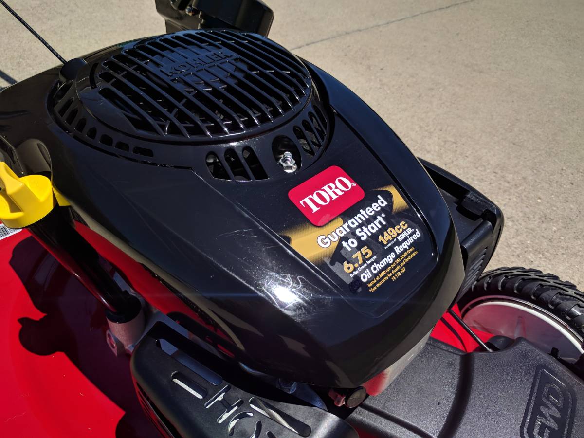 Toro front-wheel drive self-propelled mower with larger, more powerful 6.75-hp Kohler engine!! Only used once before hiring a lawn service. It runs like new, looks new, and feels and movements like new. Premium steel deck (rather than plastic, as on most recent models) with hose cleaning attachment tool Bagger for Toro included. It need an actual proven engineered air filter, not foam like the low-cost models. This type looks a much like a Honda lawnmower.