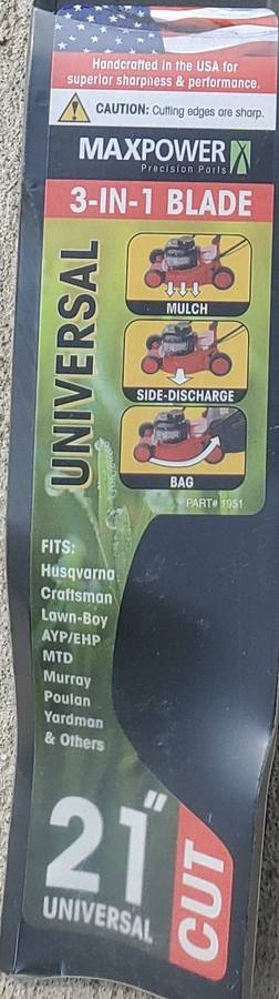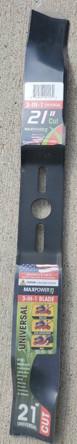 I’m offering a 21″ Cut – Universal 3 N 1 Lawn Mower Blade… Mulch / Side Discharge / Bag… Fits Craftsman, Poulan, Husqvarna, Lawn Boy, MTD, Murray, Yardman, and other brands… MAXPOWER Precision Components… Handcrafted in the United States for Maximum Sharpness and Performance… I’m selling for $15 firm… please call me if you’re interested.