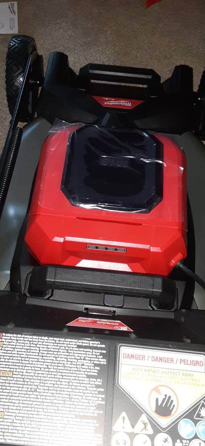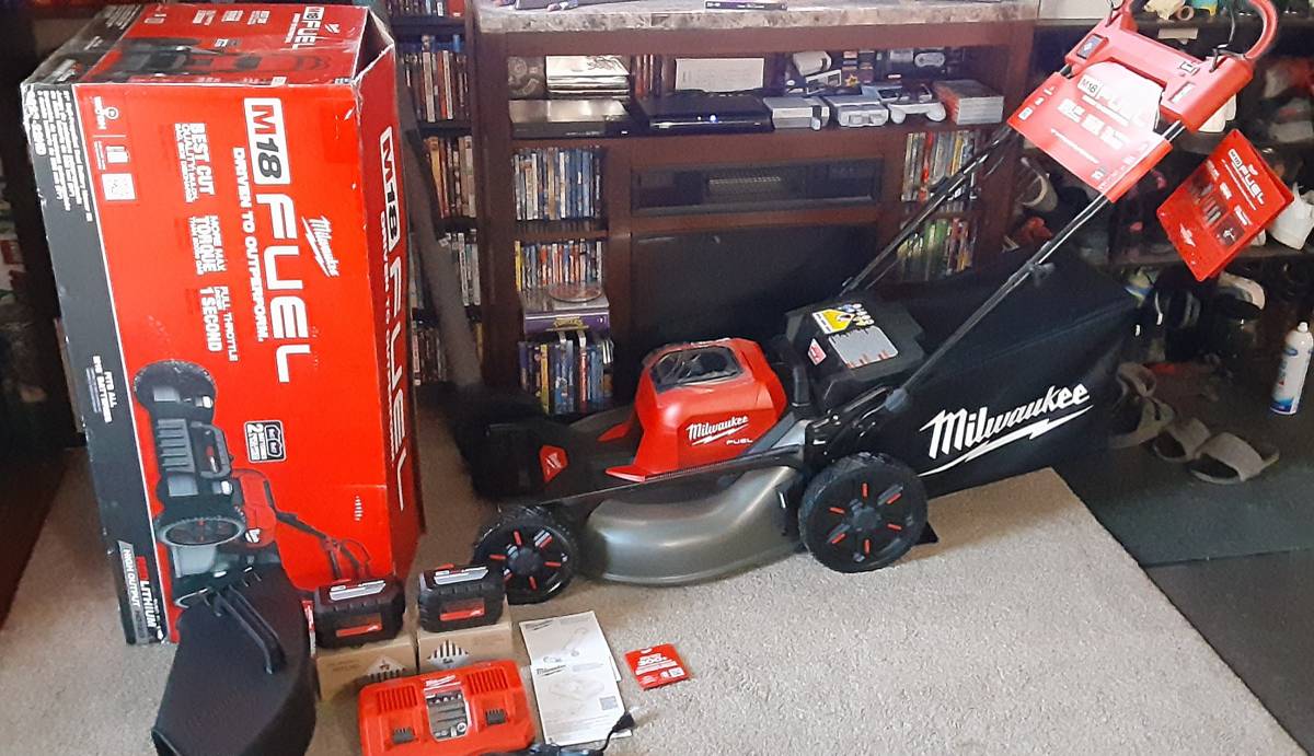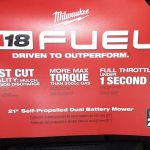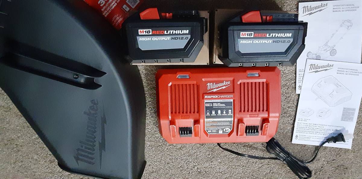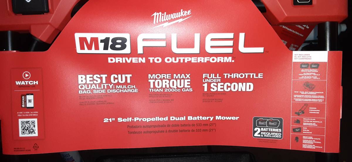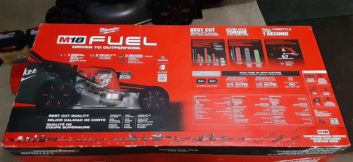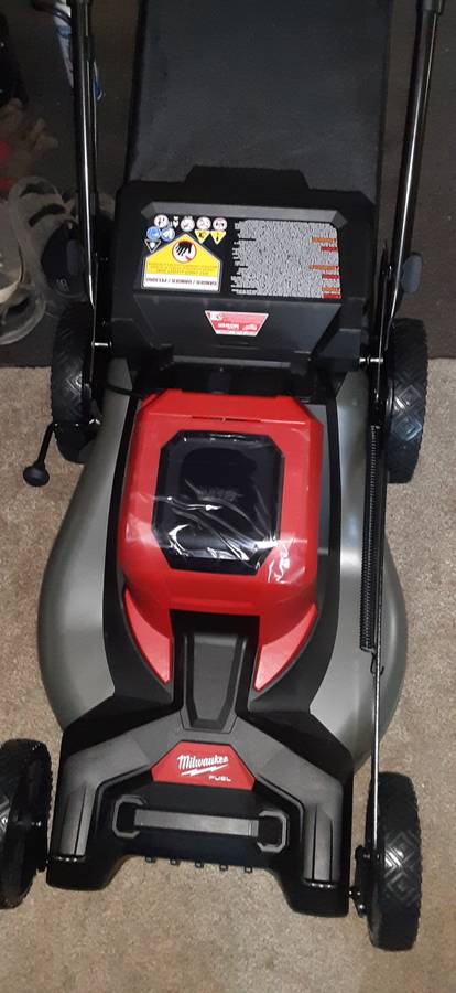 Brand new Milwaukee M18 FUEL cordless lawn mower with a 21-inch deck, self-propelled, includes bag or mulch options, single lever adjusts all four wheel heights, equipped with headlights, comes with two 12ah HIGH OUTPUT batteries, dual rapid charger, Model 2823-22HD, features a drive handle that locks forward for storage, and boasts the latest design with two handles. Never been used.