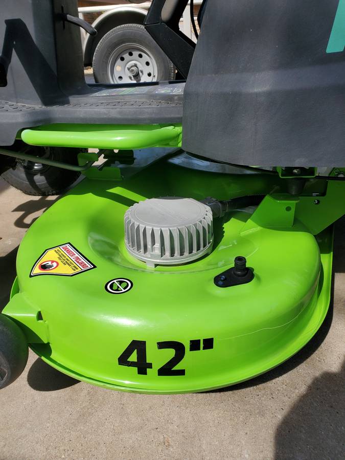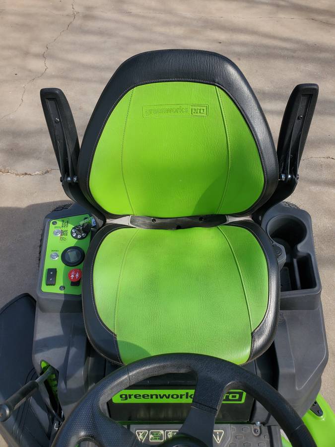 I am selling a Greenworks Pro electric riding mower that is almost new, measuring 42 inches and with only 12 hours of use. This model is an upgrade from the standard Greenworks CRT426 and is designed to provide more power and longer battery life. I have already tested it by mowing both my yard and my neighbor’s, and it performed admirably. If you’re interested, you’re welcome to try it out before making a purchase. My lawn requires another mow, so feel free to use it as much as you need to evaluate the electric mower. The mower comes equipped with 6 batteries and 3 chargers, each of which can charge two batteries at once.