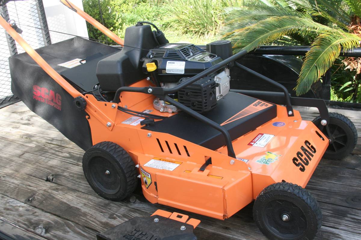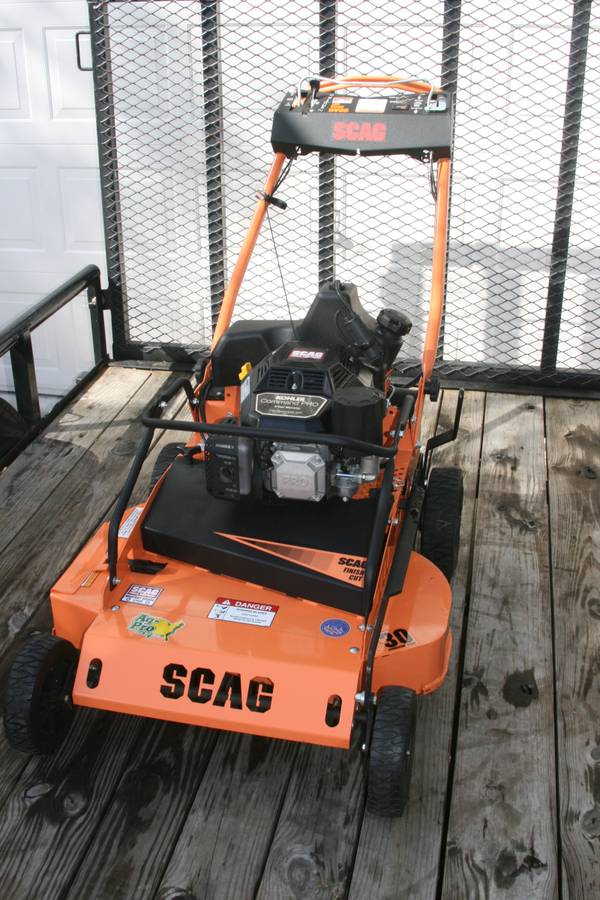 This Scag finish cut walk behind mower is in excellent condition with only 8 hours of usage by a homeowner and is available for sale. It is equipped with a Kohler Command Pro engine and features a military grade steel deck and a robust drive. The model number is SFC30-7CV.
