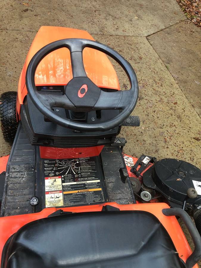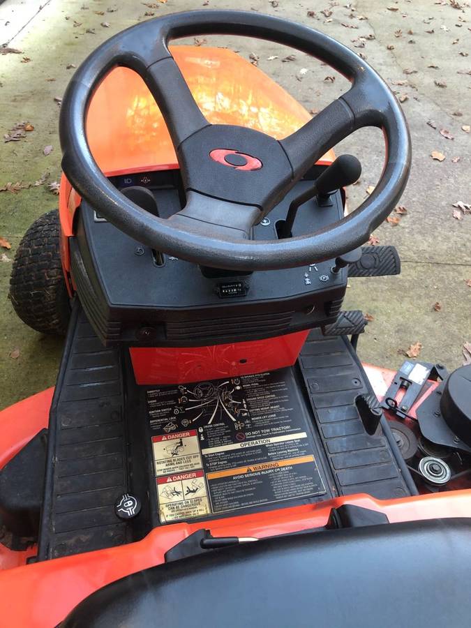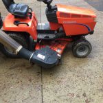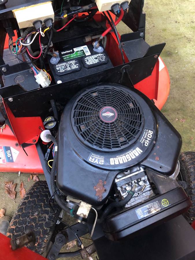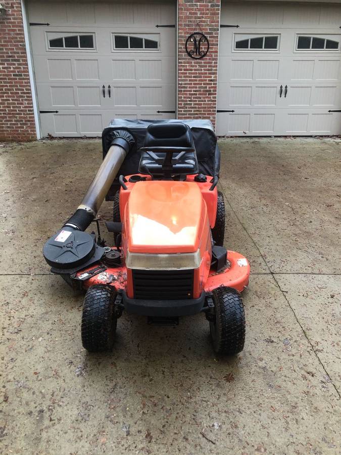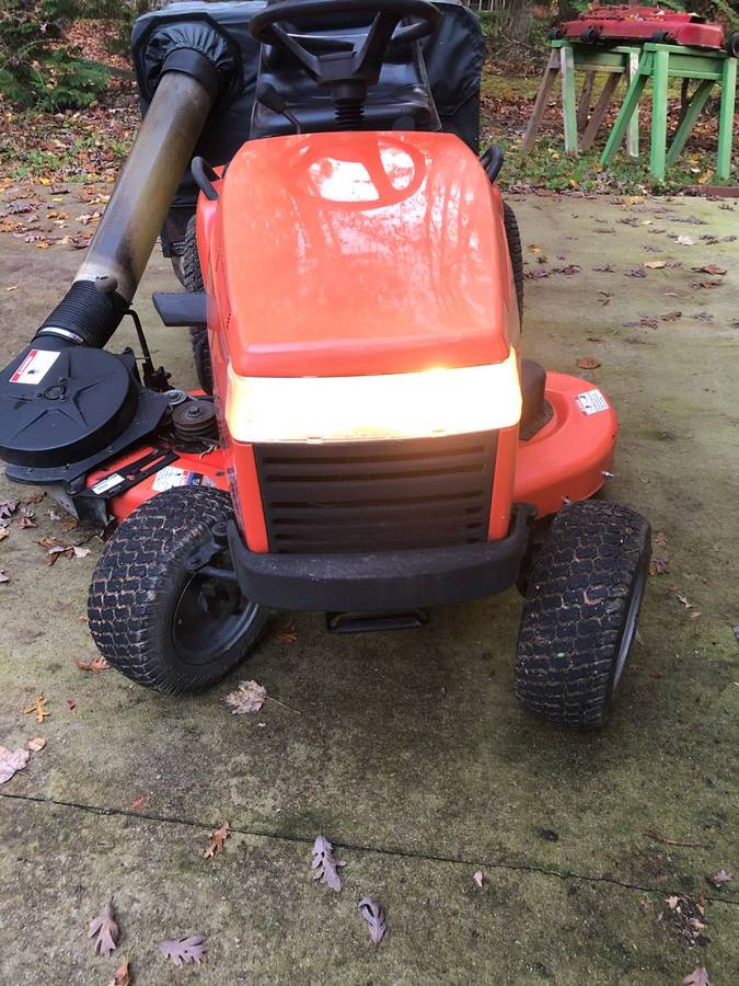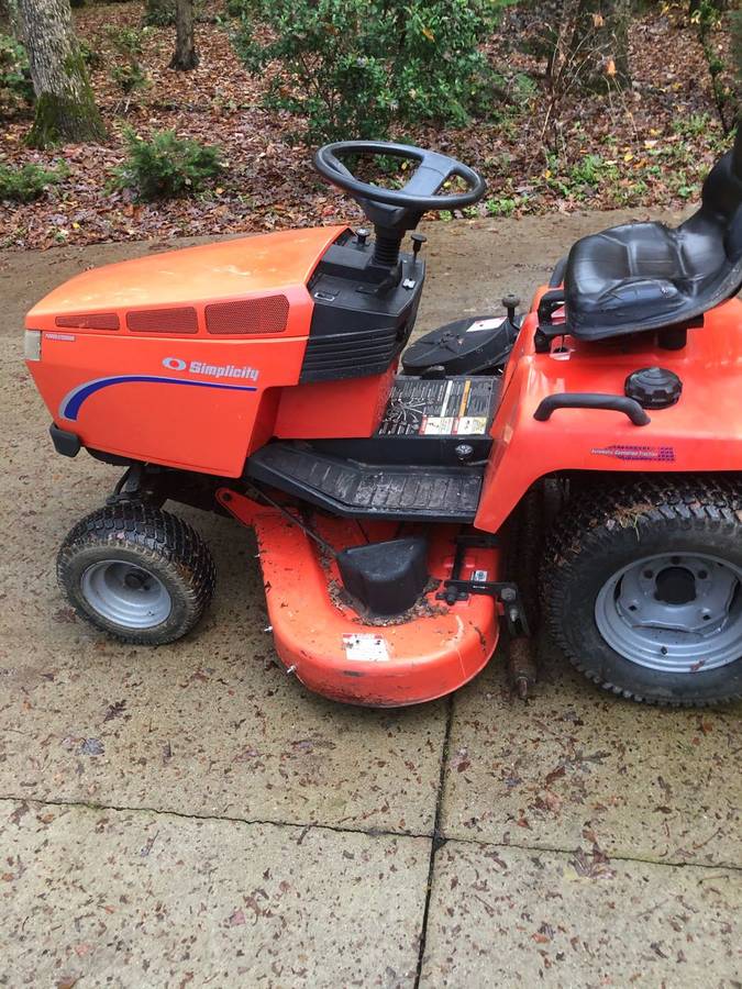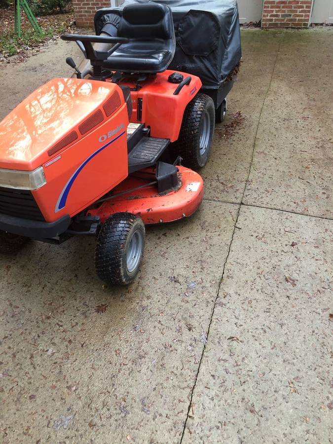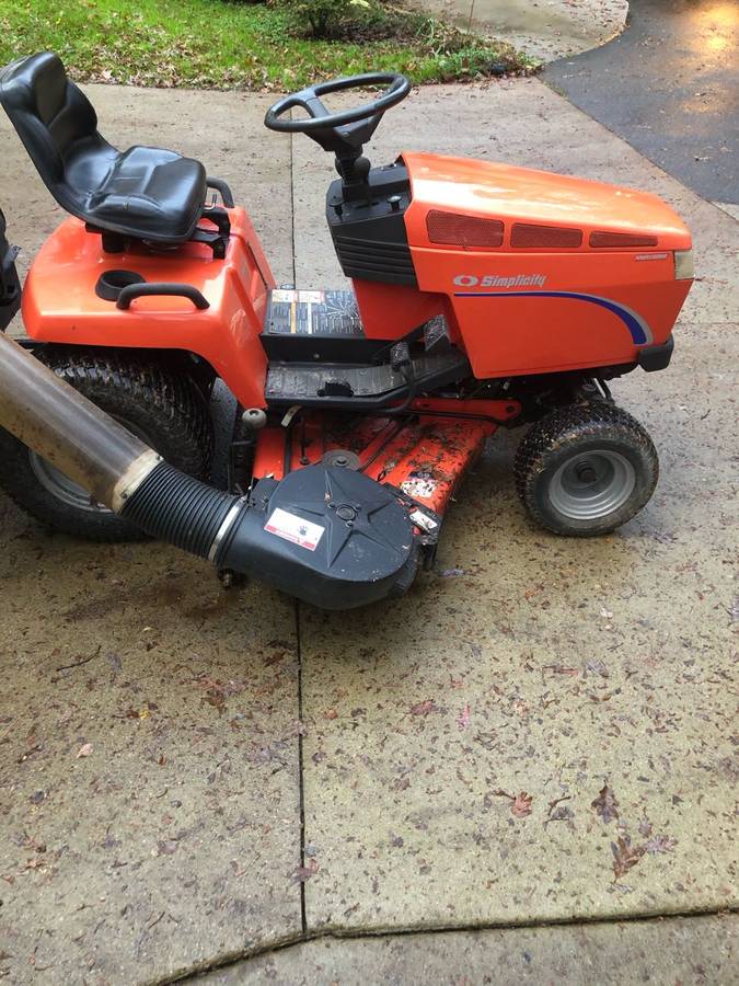 Simplicity Landlord 20 DLX riding mower with power flow and attached leaf cart. This is one owner all-metal devices that was a new package of $7400.00. Has a 50″roller deck to strip your lawn. Leaf vacuum works perfectly (see driveway photos where I picked up wet leaves) and seems to be very easy to dump. 20HP Vangard engine that was just tuned up. Has a larger Tuff Torq transmission (K71) than John Deere 345 and has auto traction control. (already has a positive lock you can engage) Power steering and hydraulic deck.