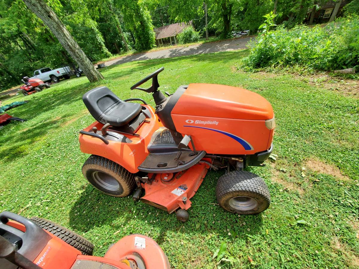 Legacy 25HP Kohler Command engine from Simplicity. Power steering, shaft-driven hydrostatic transmission with high/low range and automated traction control, foot-operated locking differential, and cruise control with around 995 hours on the clock. Very easy to drive, with foot controls for forward and reverse. Temperature and fuel gauges, a tachometer, and many indicator lights are all found in the instrument cluster. There is a three-point hitch, but the lowest links are missing.