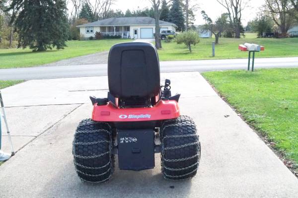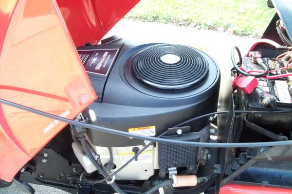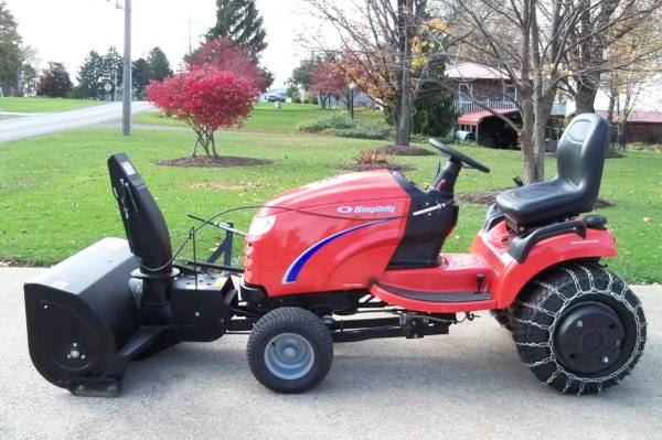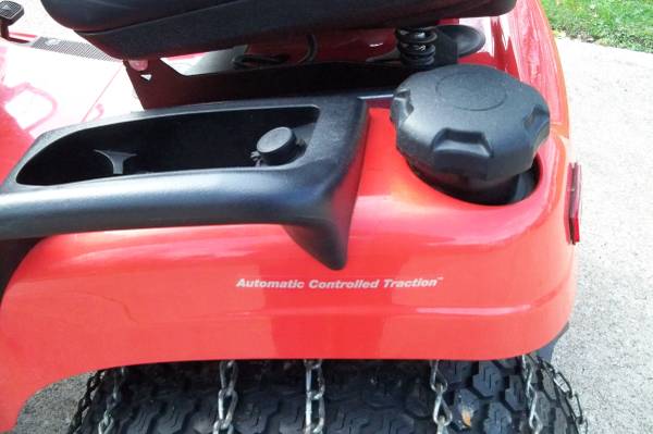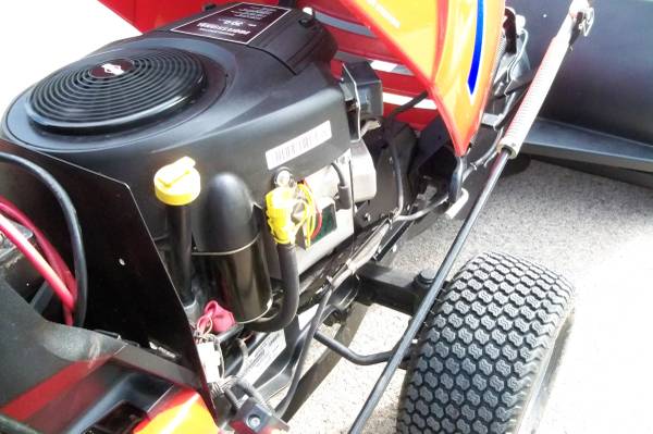 This used lawn mower has a cruise control, a 12V power outlet and a drink holder, a seat adjustment lever, a parking brake and is very comfortable. I already put in a brand new battery and it’s ready to go. This mower is like a new one and only has less than 160 hours on it and probably 40 hours on the mower deck. It measures 75″Lx 62″W with deckx 47″H and 16×6.5 front and 23×10.5 rear turf tires. It did come with handbooks and extra filters for oil and air. I’m not interested in breaking this package deal and selling a tractor or an implement. Premium2-wheel drive (with posi-traction lock) tractor for mowing or snow removal. This tractor has a powerful V twin 30 HP Professional series Briggs and Stratton engine with electronic fuel management that delivers consistent automotive style start, Hydraulic mounting lift, 42″ 2-stage snow jet and subframe with electric beam rotator and beam deflector control that can be used from the driver’s seat, Tire chains and weights, A 52″ heavy duty manufactured mower. The cutting height can be precisely adjusted and provides one of the best quality cuts I saw with the full width rear rollers making a distinctive stripe pattern in your lawn, Halogen headlights, Adjustable steering column tilt, and all steel hoods and fenders.
