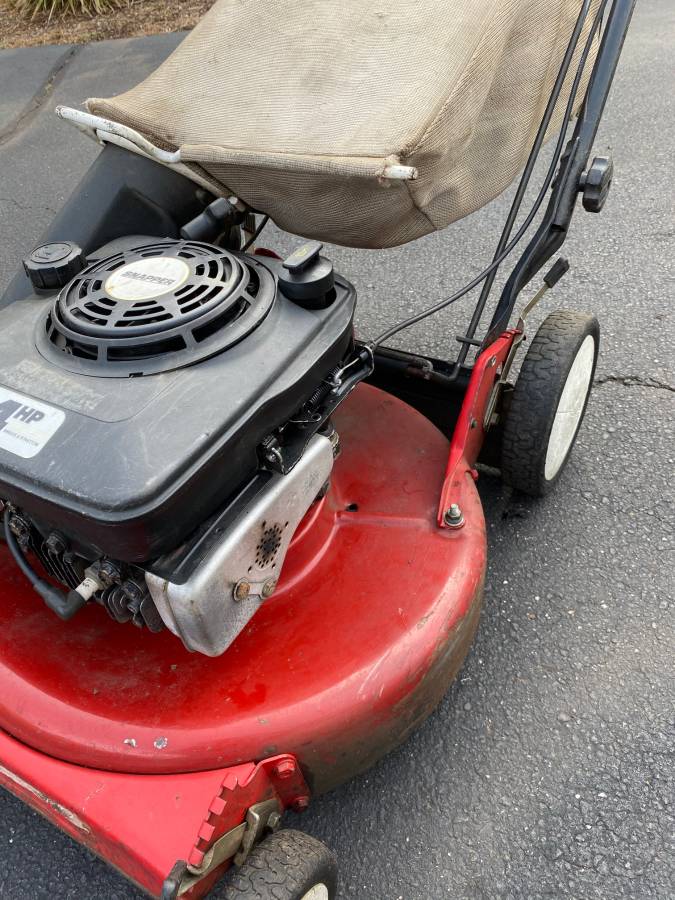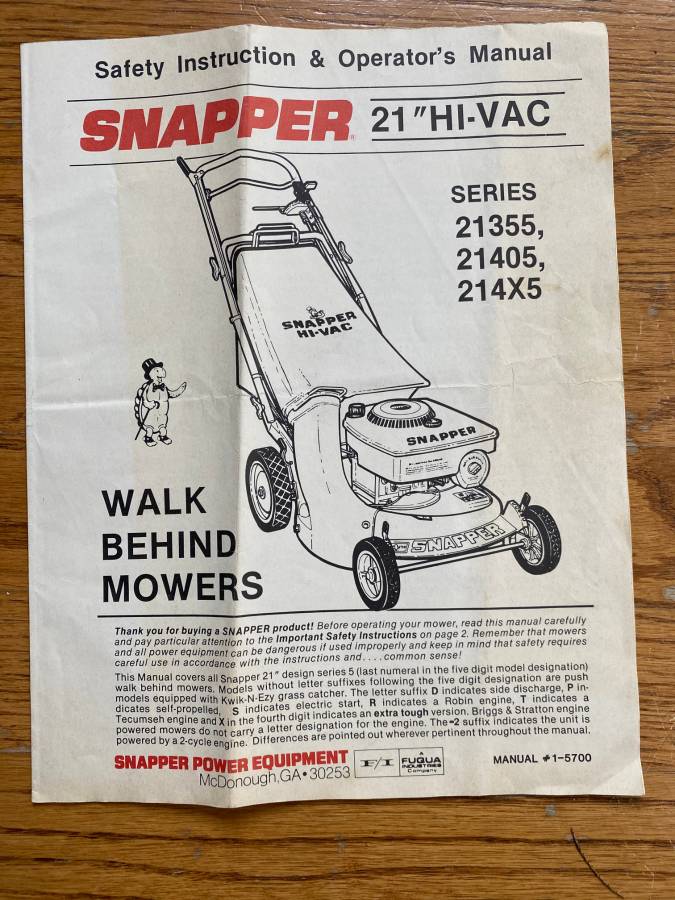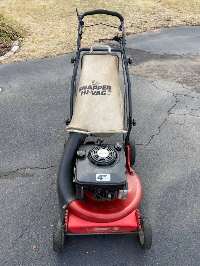 Used Snapper 21 “Walk Behind Hi-Vac Lawn Mower, self-propelled, multi-speed. Includes the Chute and Grass Catcher Bag. The Lawn Mower comes with a retro Snapperizer. The Snapperizer mulches leaves and discharges them to the Bag. The blade actually mounted on the Mower is a straight cut blade with the “Shift Pack” Snapper. The Mower ships with a Snapper Mulching Tool, which is used in combination with a Snapper Chute Plug. An additional 21 “straight cut blade is included. Price $50, since the engine burns oil And has low power, and many good parts.