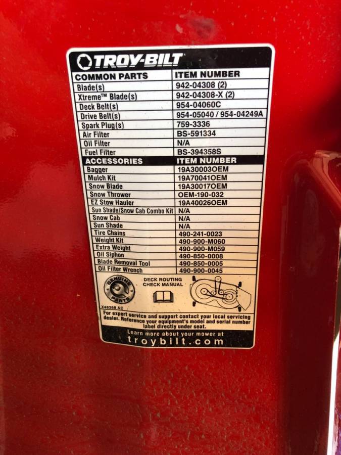 Troy-Bilt 13AM77KS011 7 Speed Riding Lawn Mower bought in Sept 2016 for 1350.00 (including tax) and placed 12 cuts on the previous yard, moved to Saint Joseph and the yard here requires a push mower. Everything you need to know is in the pictures, there’s absolutely no scratches, no corrosion, no dings that haven’t been out of the garage since we moved here.