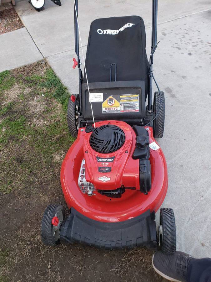 Troy-Bilt Tb110 140cc Push Mower 550ex Series. Condition Is New. Grandma probably only used it a few times, but I ch new one pull start less than a year old garage kept. There are no holds or checks. This walk behind lawn mower has a dependable 140cc Briggs & Stratton engine that delivers reliable power to get the job done right, as well as Ready Start technology for easy, no-prime, no-choke starting. With 11 wheels, the TB110 has improved traction and maneuverability on hills and over rough spots . A 21″ with mulching and bagging capabilities, the steel deck provides long-lasting durability (1.9 bushel bagger included). You can rely on Troy-Bilt to make yard work easier.