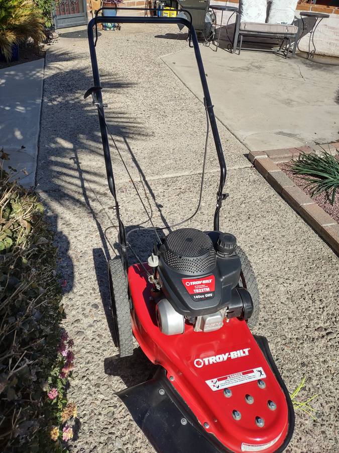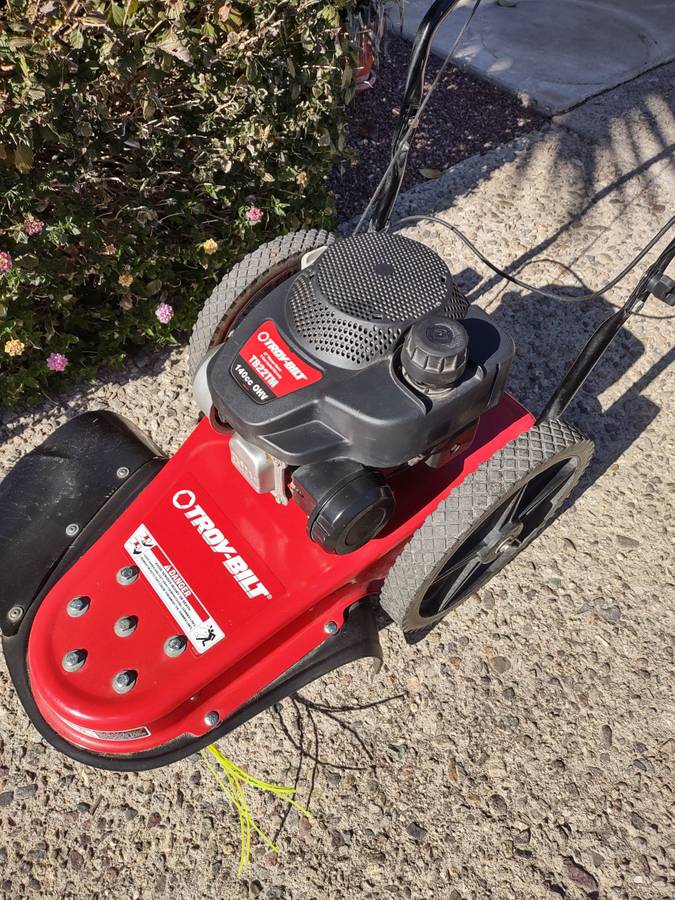 This Troy-Bilt commercial grade walk behind string trimmer is an excellent choice for farm, ranch, landscapers, or weeded areas or brush areas around residences, alleys, etc. With a powerful 140 cc engine, 22-inch trimmer mower, and large rear wheels, this trimmer is sure to get the job done quickly and easily. It features adjustable heights for the handle and string, and starts immediately with a new string line. This trimmer is like new and much cheaper than buying a new one. Unlike a Weed eater, this trimmer is much more powerful, offers a wider cut, and is easier to use due to its 4-cycle engine for long life and no need to mix gas and oil. With hardly any use, this trimmer is sure to provide excellent performance and value.