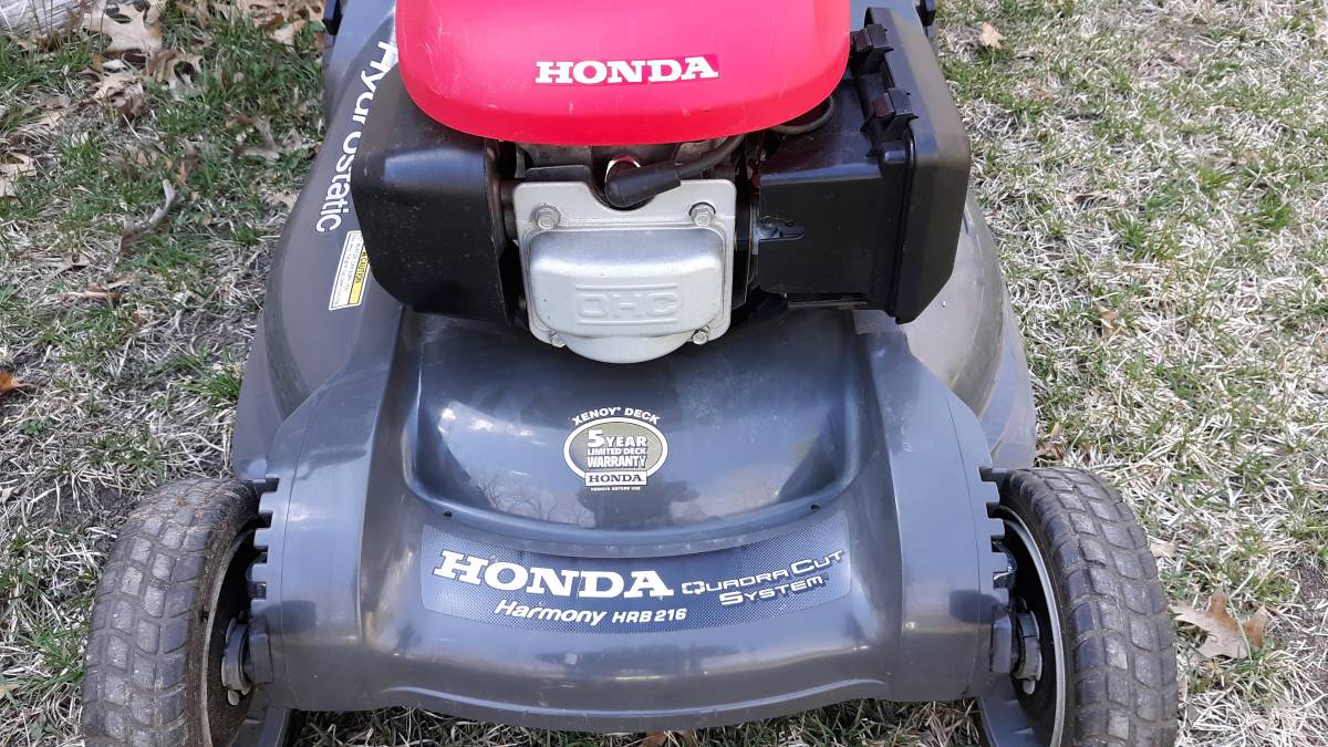 Used Honda Harmony HRB216HXA hydrostatic lawn mower for Sale. Clean and in good working order. Hydro is working perfectly. It’s got a roto stop blade clutch. Sat for a couple of years, because it wouldn’t roll back without the wheels lock. . I installed a new rear wheel hub assembly on the left, along with new bushings and a seal on the right. With no binding, you can easily pull this computer backwards. Drive pinions / springs clean and in excellent condition. Drive gear on the rear wheels in excellent condition. Complete tread on all the tyres. All cable improvements have been made. The engine controlled by the top speed has been set. The blades were sharpened. Fresh change of oil and a new air filter. I mulched a lot of leaves, and everything works great. It comes with a bag and a mulch plug.