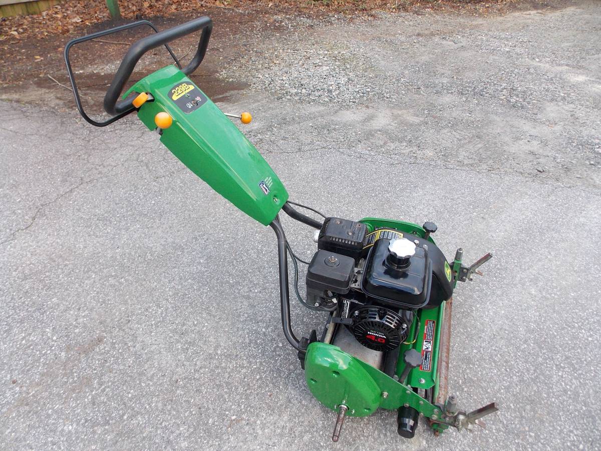 Used John Deere 220B Walk greens reel lawn mower with 11-blade roller and grass catcher. Reel’s 100 percent life, it was just replaced this summer! It’s got a powerful Honda 4.0 HP. Fresh oil gas engine, air filter and new carburetor. We’re going to sharpen the mower until we ship it so it’s ready to mow.